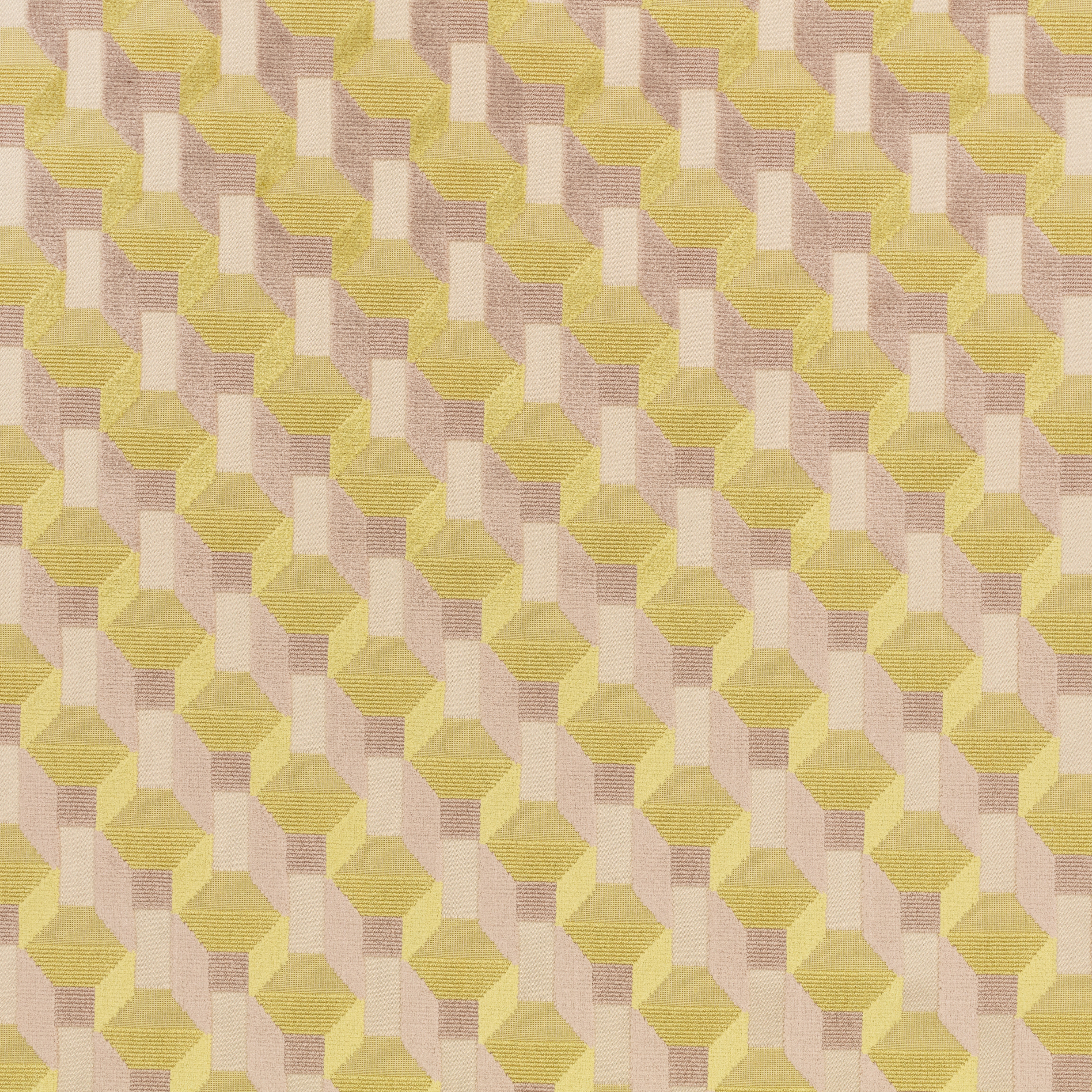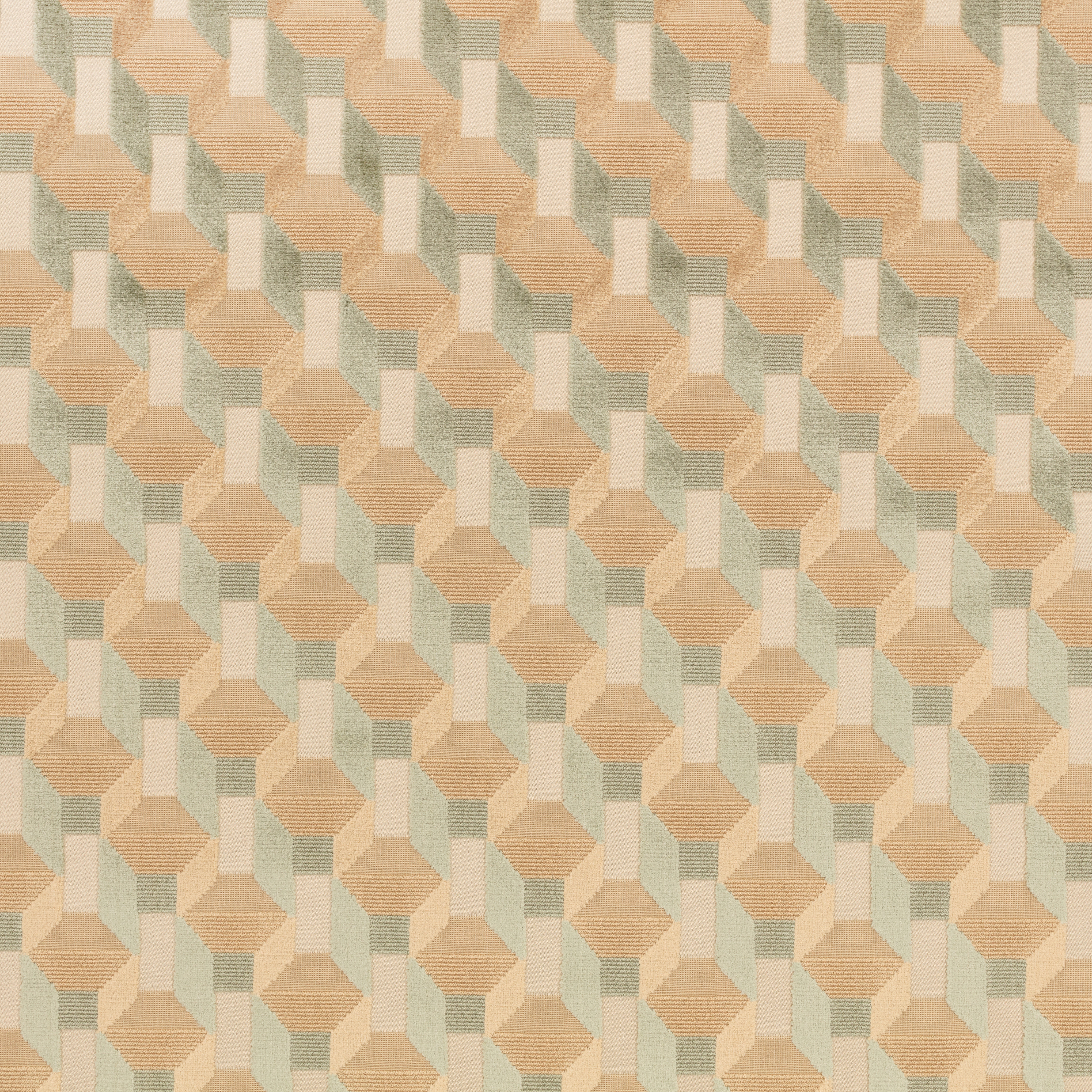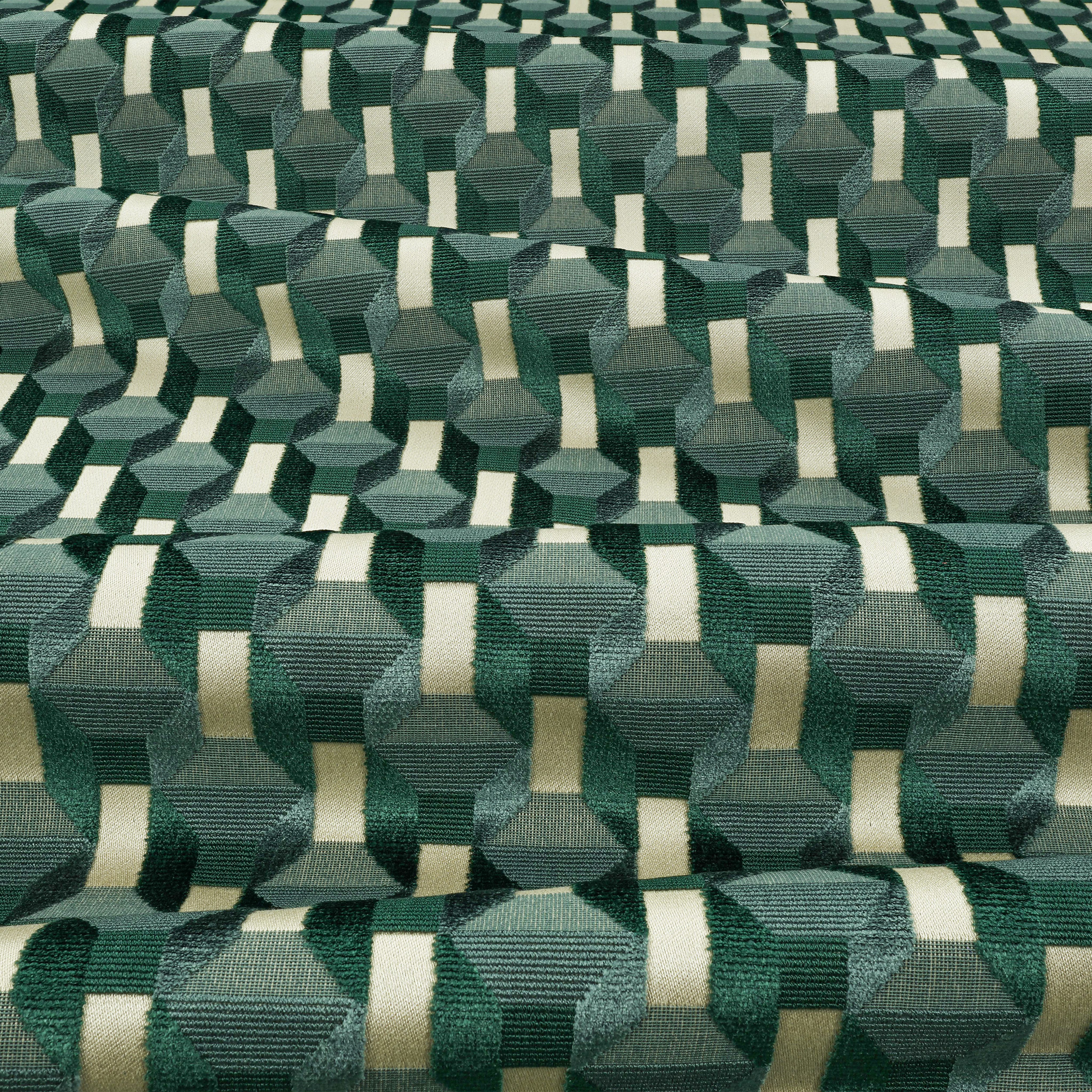 Ein geschnittener und ungeschnittener Samtflor verleiht einem zeitgenössischen geometrischen Muster in einer modernen Farbmischung Textur und Dimension. Durch die geschickte Platzierung von hellen und dunklen Farbtönen entsteht ein 3D-Effekt, als ob sich die Würfel vom Stoff abheben würden.