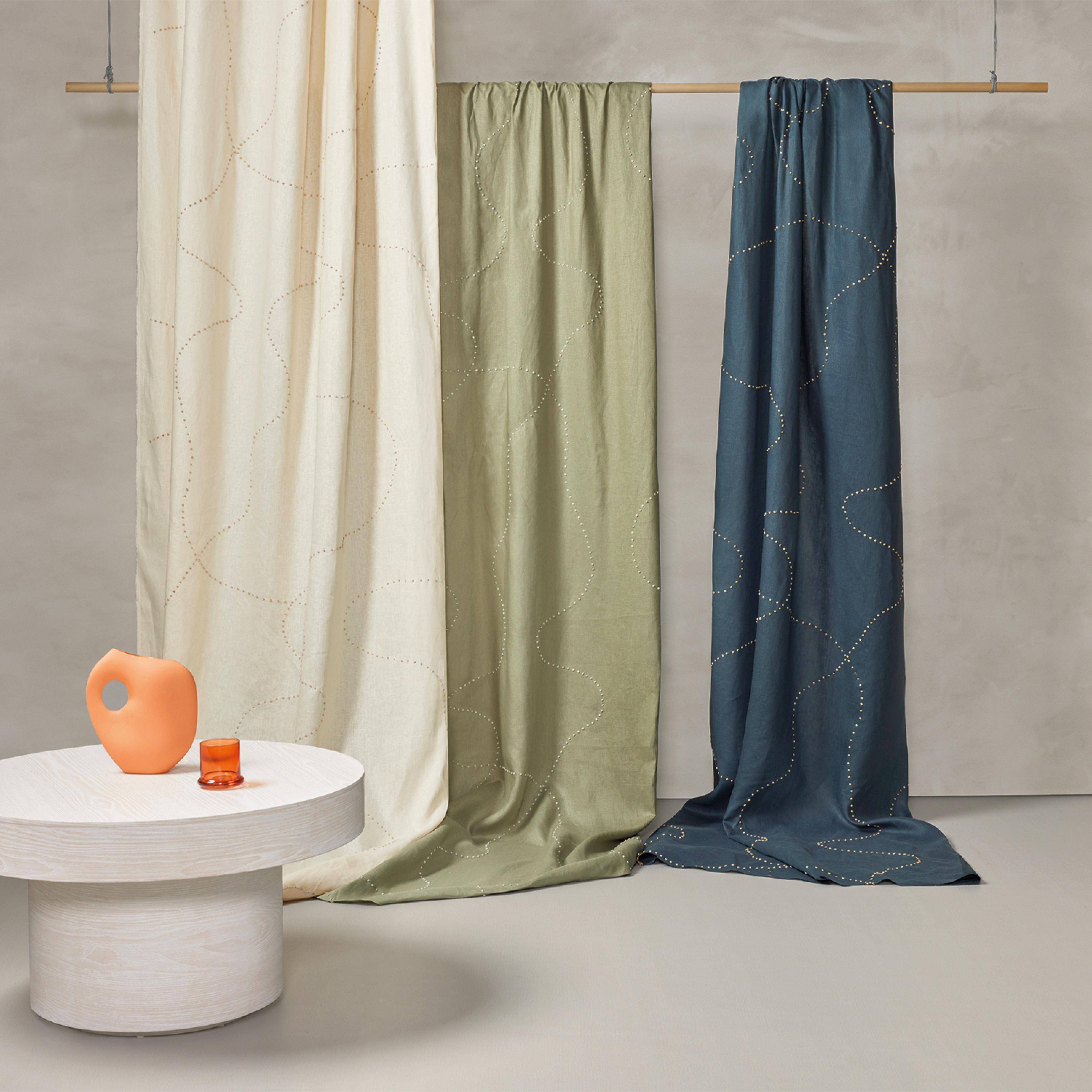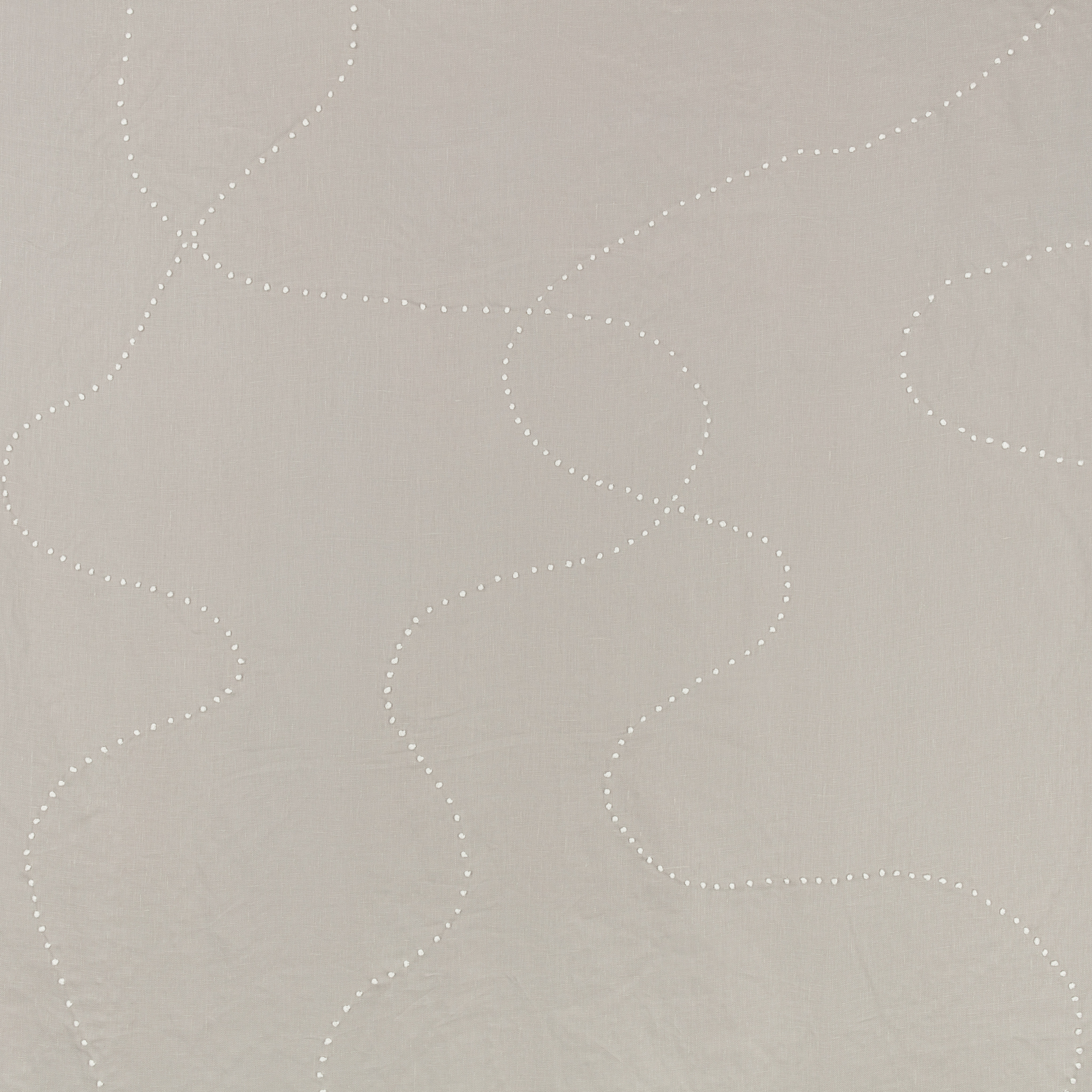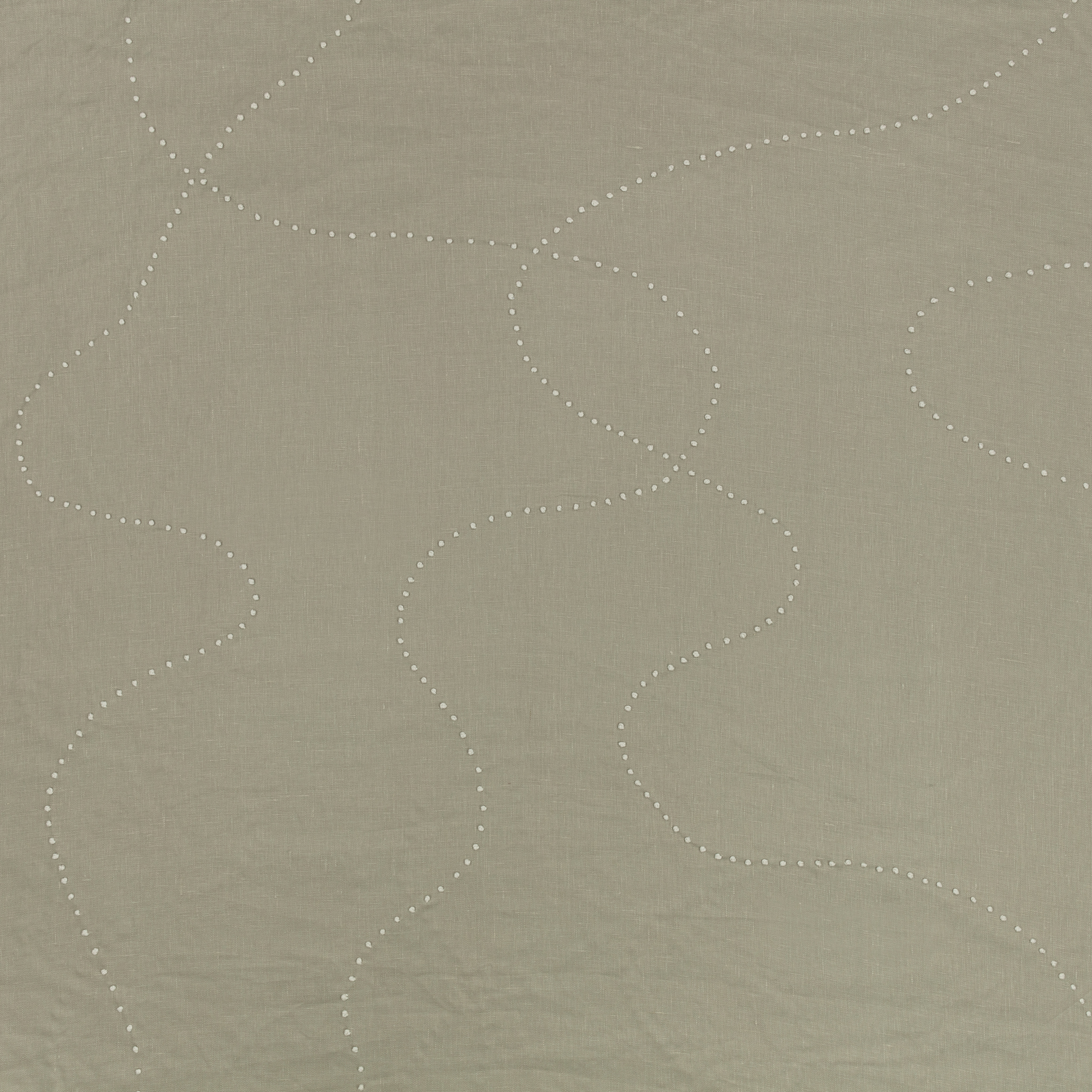 Die gepunkteten Wellen der handgeknüpften Stickerei fließen über ein entspanntes Leinen, das für zusätzlichen Charakter ein getrommeltes Finish erhalten hat, mit einem leichten und luftigen Griff, wie geschaffen für Drapierungen. Die sanft geschwungenen Linien harmonieren perfekt mit der entspannten Qualität des Leinenstoffs und vermitteln ein Gefühl von Bewegung und moderner Eleganz.