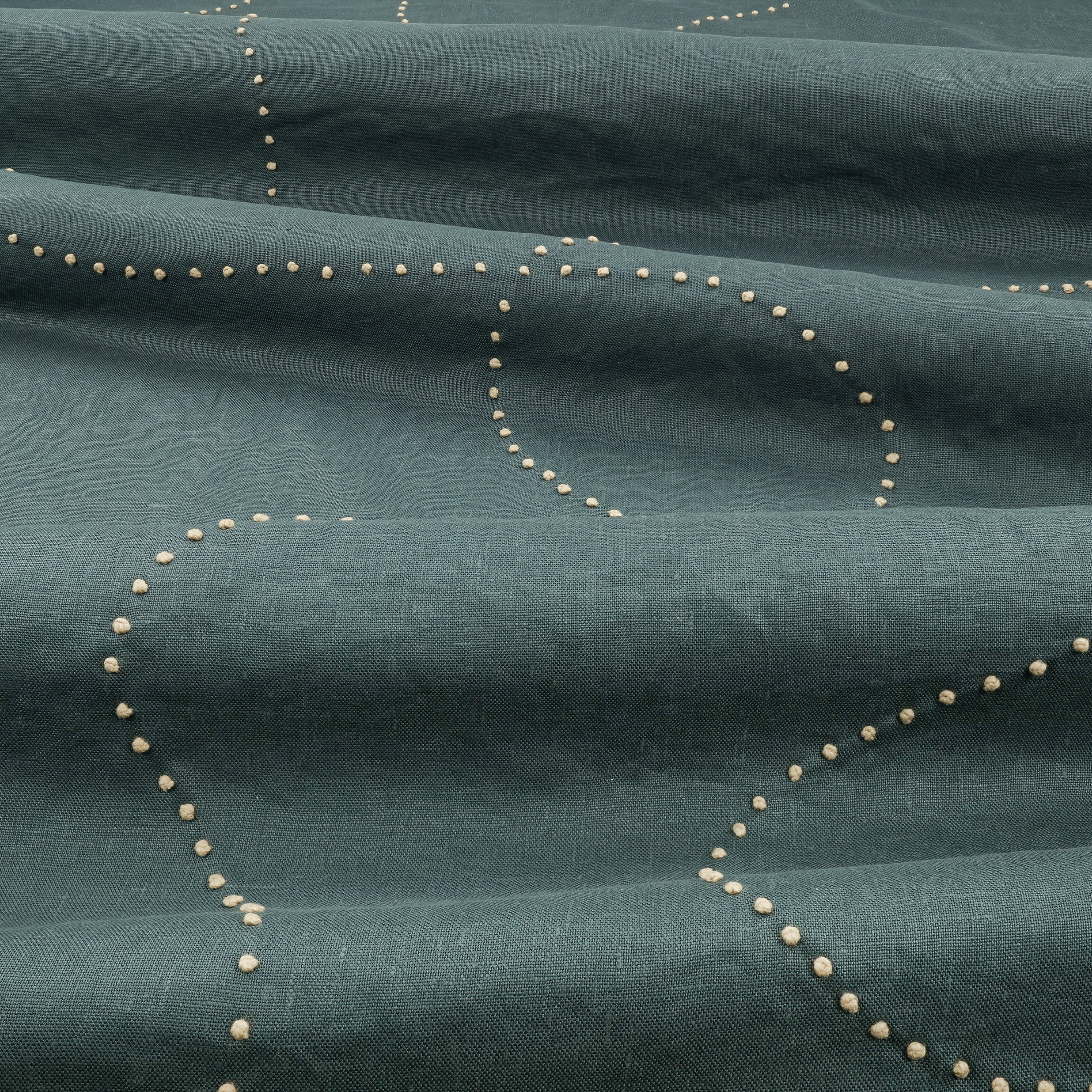 Die gepunkteten Wellen der handgeknüpften Stickerei fließen über ein entspanntes Leinen, das für zusätzlichen Charakter ein getrommeltes Finish erhalten hat, mit einem leichten und luftigen Griff, wie geschaffen für Drapierungen. Die sanft geschwungenen Linien harmonieren perfekt mit der entspannten Qualität des Leinenstoffs und vermitteln ein Gefühl von Bewegung und moderner Eleganz.