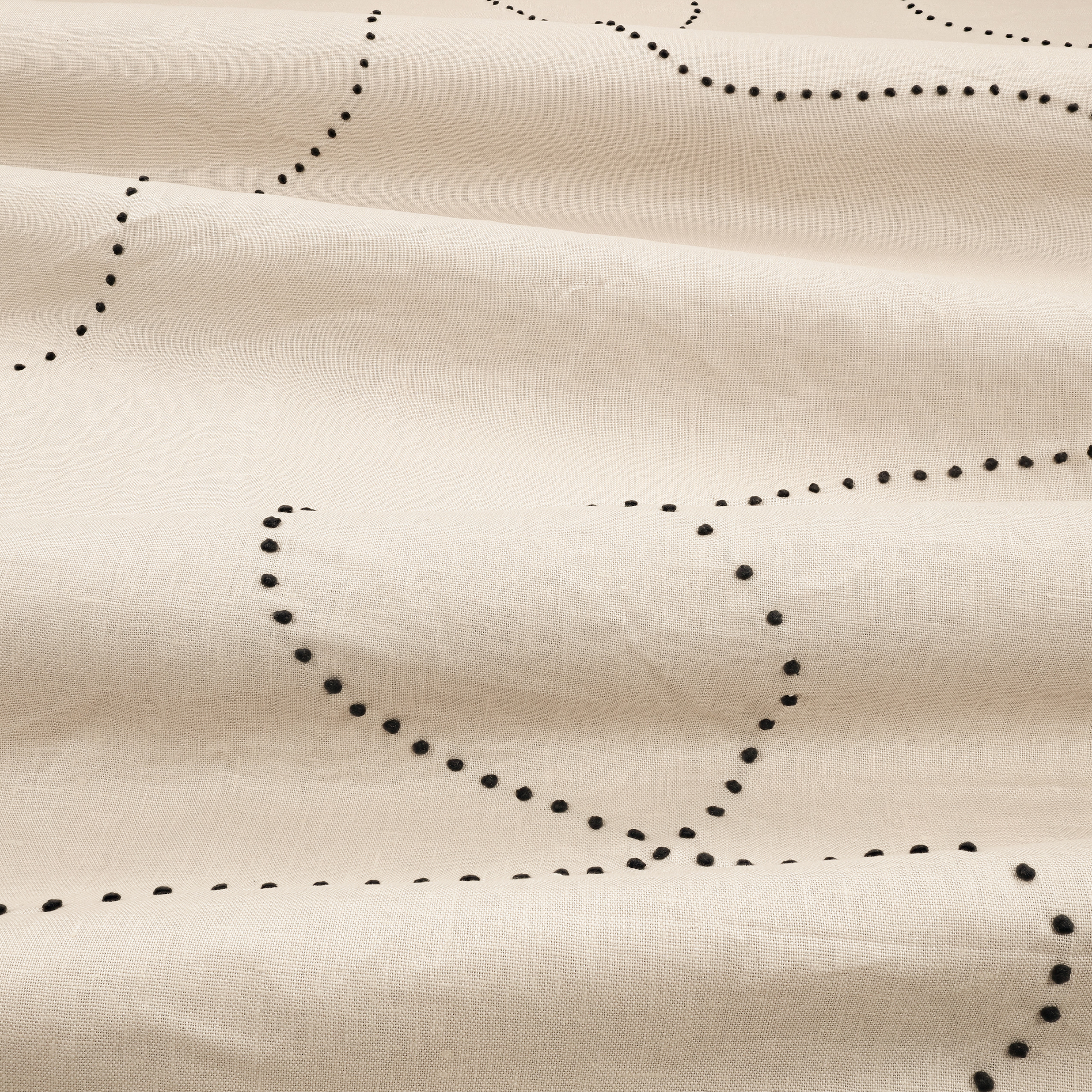 Die gepunkteten Wellen der handgeknüpften Stickerei fließen über ein entspanntes Leinen, das für zusätzlichen Charakter ein getrommeltes Finish erhalten hat, mit einem leichten und luftigen Griff, wie geschaffen für Drapierungen. Die sanft geschwungenen Linien harmonieren perfekt mit der entspannten Qualität des Leinenstoffs und vermitteln ein Gefühl von Bewegung und moderner Eleganz.