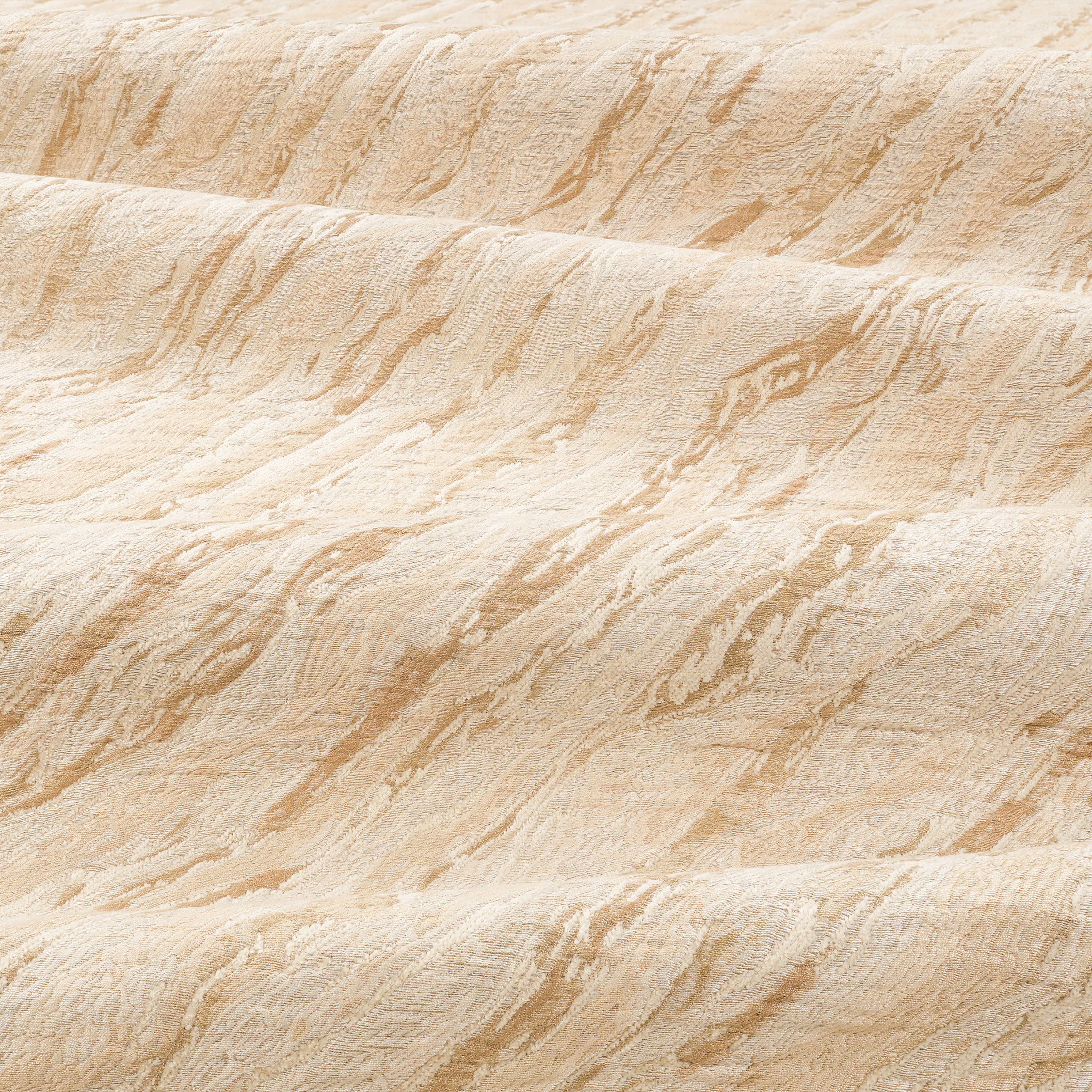 Ein handgezeichnetes und gemaltes Design, das einen geografischen Querschnitt von geschmolzener Lava darstellt, wird durch ein kompliziertes Taschengeflecht wiedergegeben, das Schichten von Textur zeigt, während weiche Chenille über einen detaillierten Jacquard fließt.
