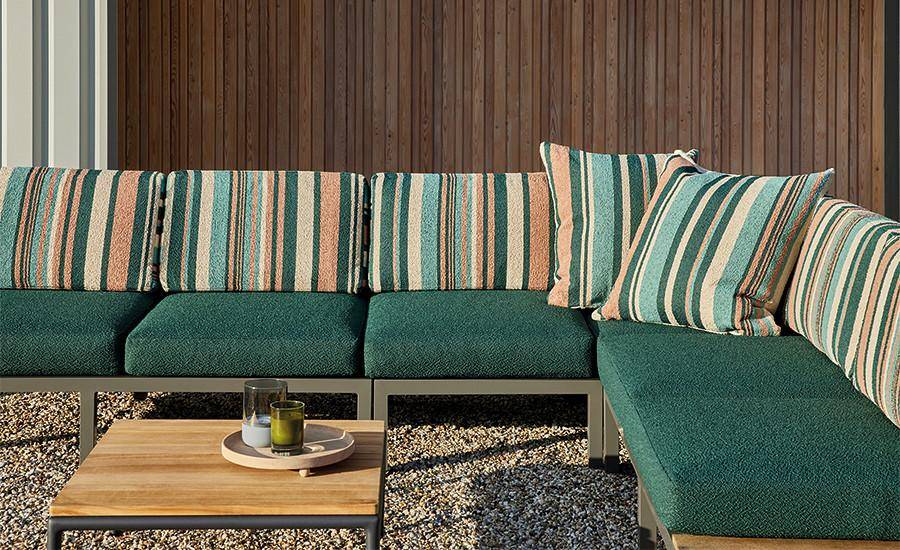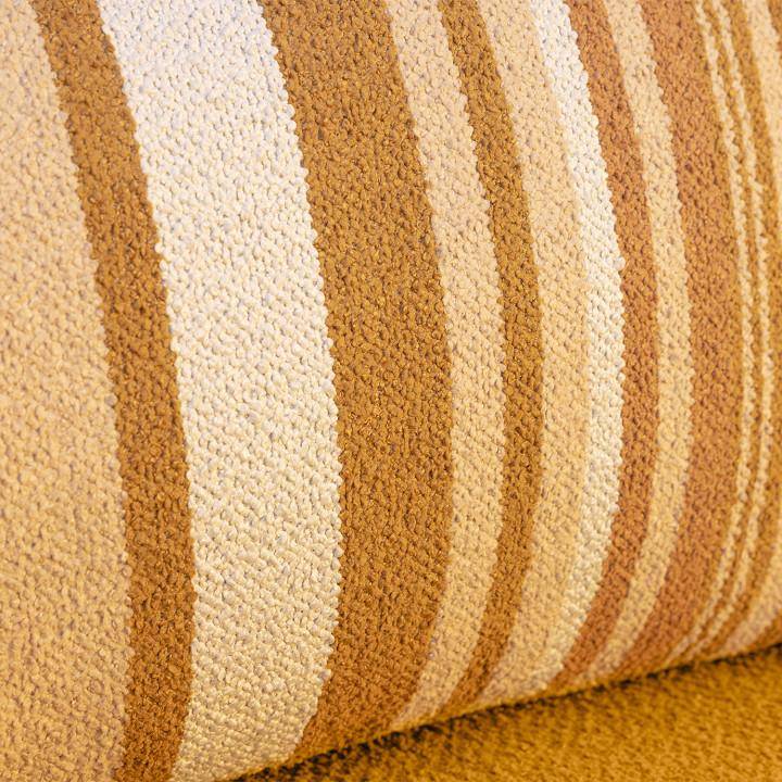 Tide ist ein unregelmäßiges, mehrfarbiges Streifendesign, das aus 100 % recycelten Polyestergarnen gewebt wurde, die aus Plastikflaschenabfällen hergestellt wurden, und besticht durch Muster und Textur. Die Bouclé-Garne sorgen für Taktilität und der Mix aus gedeckten und leuchtenden Farben unterstreicht die moderne Ästhetik. Die Unregelmäßigkeit der Streifen sorgt für ein entspanntes Gefühl und bricht mit der Symmetrie eines traditionellen Streifenmusters.