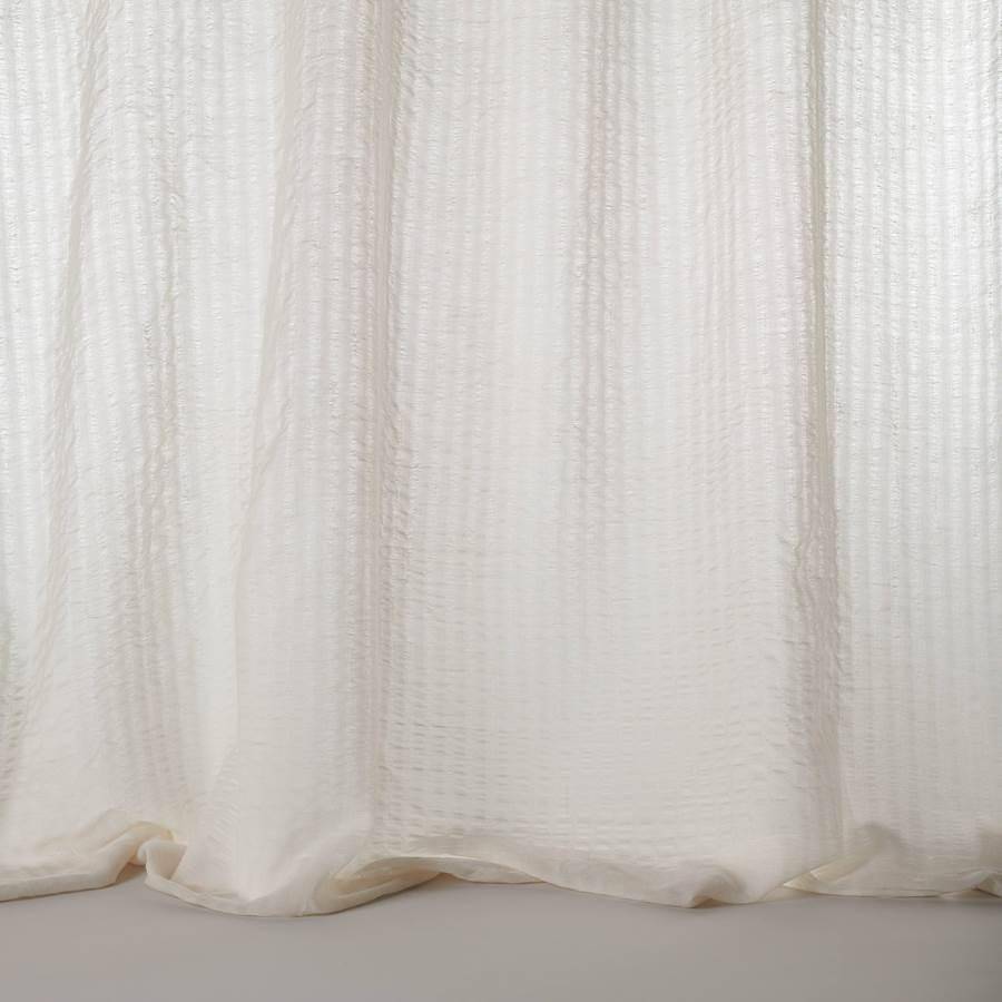 Dieser leichte, transparente Stoff spielt auf raffinierte Weise mit dem Licht, indem er dünne, offene, ineinander verwobene Streifen verwendet. In doppelter Breite kann das Muster sowohl horizontal als auch vertikal verwendet werden.