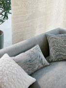 Ein großes Palmenmuster schimmert durch das unregelmäßige Gewebe, als ob die Blätter aus einem rauchigen Nebel aufgetaucht wären. Das fotografische Muster wird vor dem Weben auf das Garn gedruckt, so dass es durch die gewebte Struktur hindurchscheint.