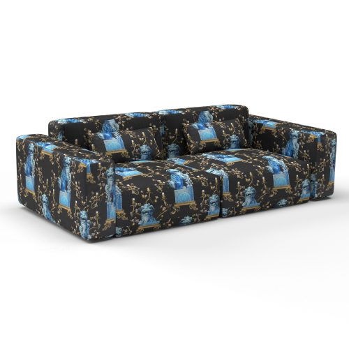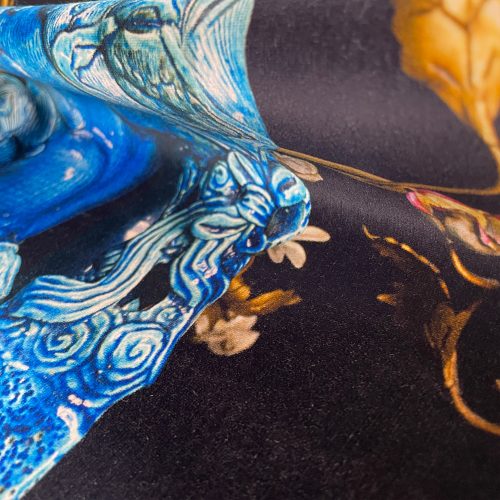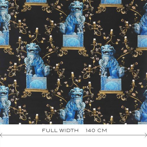 Im Zentrum des opulenten Musters steht der chinesische Fo-Hund, auch bekannt als Tempelwächter – eine kraftvolle Figur, die Schutz und Stärke symbolisiert. Umrahmt wird dieses Motiv von verschnörkelten Leuchterelementen und floralen Details, die dem Design eine barocke Eleganz verleihen. Das Muster ist auf dunklem Hintergrund arrangiert, wodurch die farblich abgestimmten blauen Skulpturen besonders eindrucksvoll zur Geltung kommen.