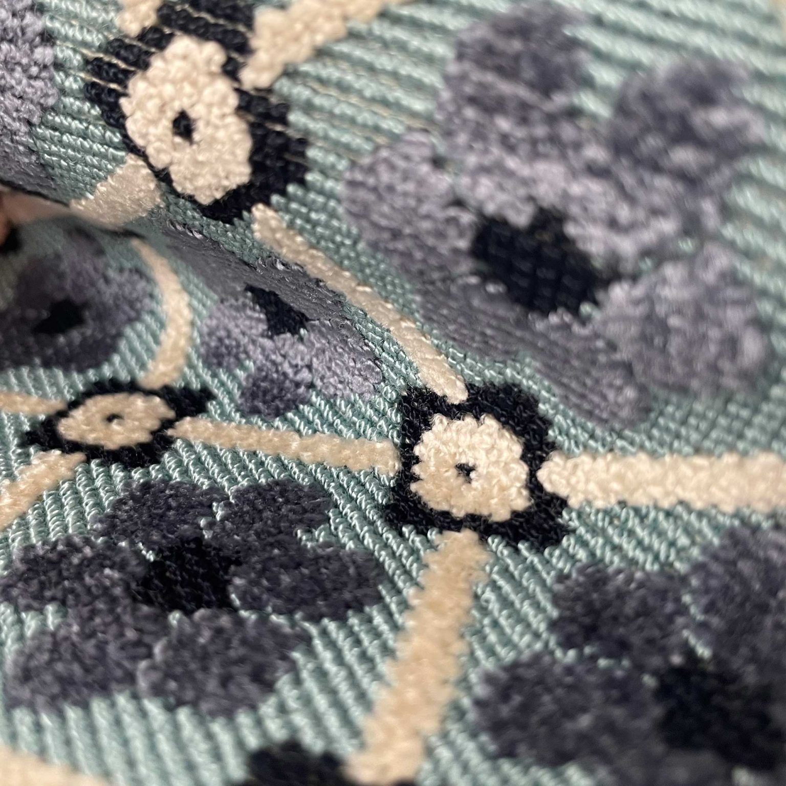 Der Fruela Stoff von Lorenzo Castillo, erhältlich bei Villakontor® online, besticht durch seine hochwertige Materialzusammensetzung aus 76 % Viskose und 24 % Polyester. Gewebt als edler Viskosesamt mit beeindruckenden 25.000 Scheuertouren, bietet dieser Polsterstoff sowohl Eleganz als auch Langlebigkeit. Das Muster zeigt ein harmonisches, geometrisches Raster aus wiederholten Rauten mit stilisierten Blumen in der Mitte, die durch kleine Punkte verbunden sind – ein Design, das klassisch und modern zugleich wirkt.
