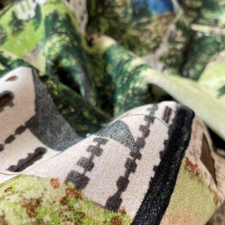 Das Design wirkt wie ein kunstvolles Gemälde einer idyllischen Landschaft, eingebettet in kräftige Grünnuancen und eine ruhige Dorfszenerie, umgeben von filigranen Baumdetails. Diese Kombination macht Gades Velvet zum perfekten Stoff für hochwertige Polster und dekorative Akzente.