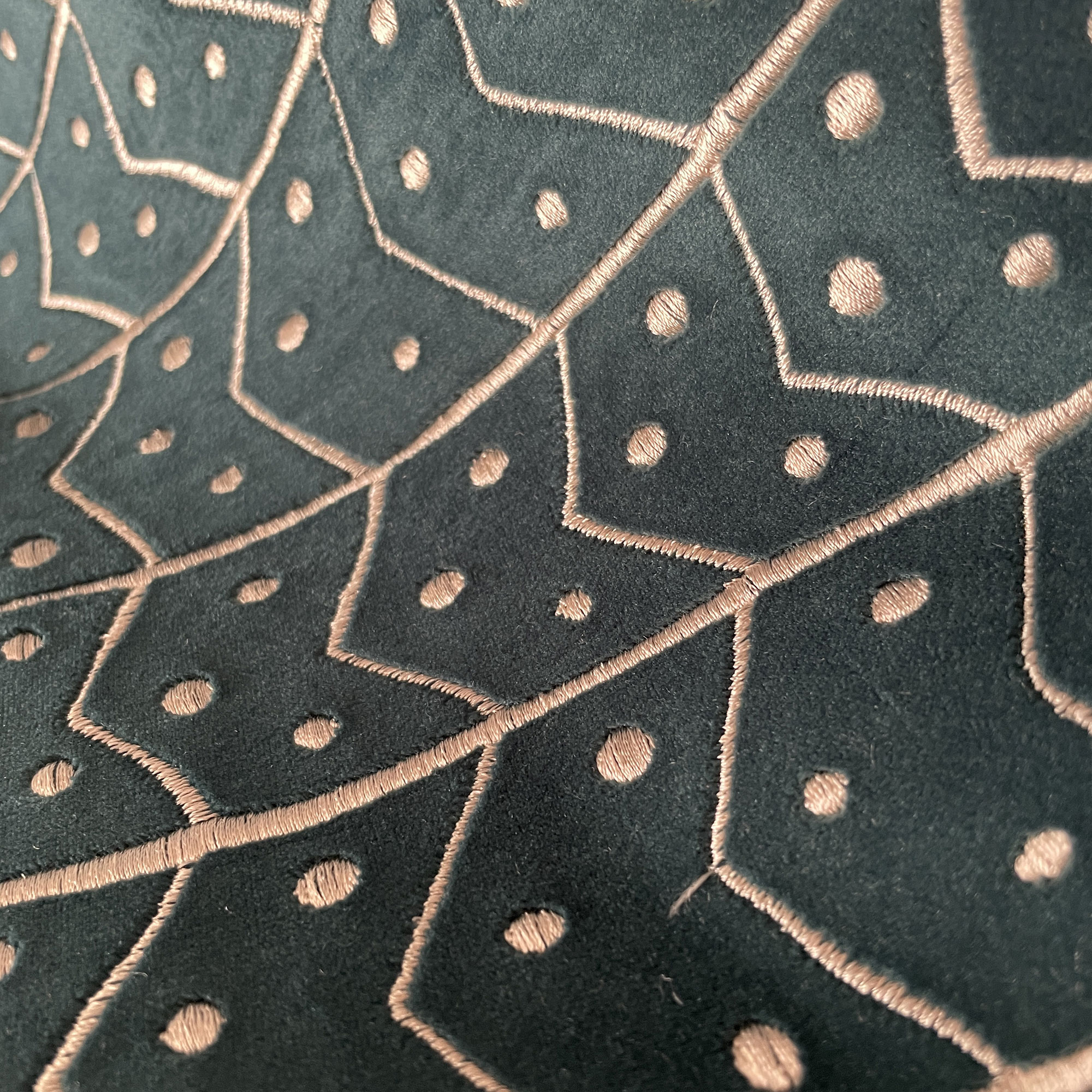 Das Design zeigt ein architektonisch inspiriertes Motiv aus gezackten Linien und kleinen, regelmäßig gesetzten Punkten. Dieses Raster wirkt rhythmisch und zugleich organisch, was dem Stoff eine unverwechselbare Tiefe verleiht. Mit 100.000 Scheuertouren ist Macarella besonders robust und eignet sich ideal für Polster- und Dekorationsprojekte mit hoher Beanspruchung.