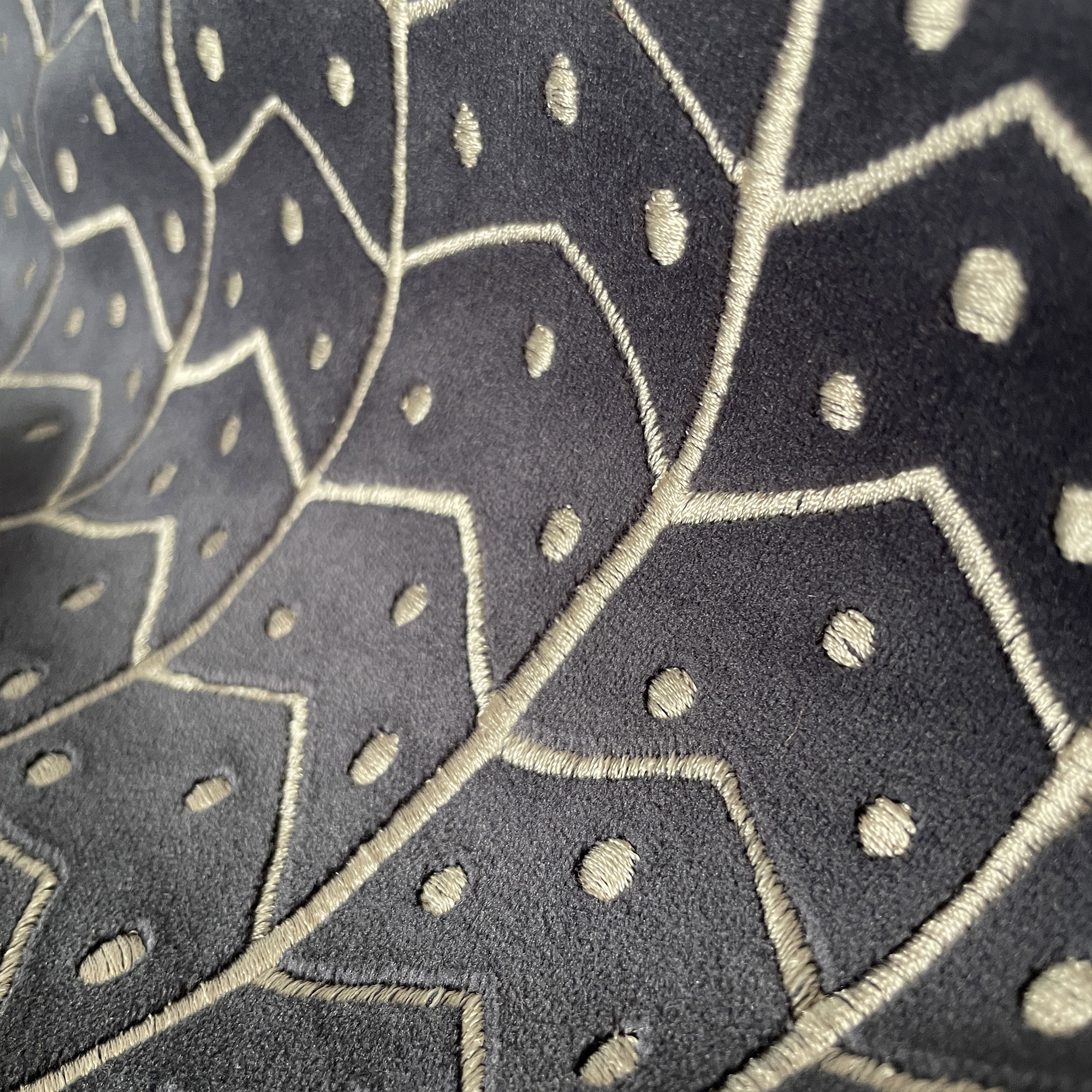 Das Design zeigt ein architektonisch inspiriertes Motiv aus gezackten Linien und kleinen, regelmäßig gesetzten Punkten. Dieses Raster wirkt rhythmisch und zugleich organisch, was dem Stoff eine unverwechselbare Tiefe verleiht. Mit 100.000 Scheuertouren ist Macarella besonders robust und eignet sich ideal für Polster- und Dekorationsprojekte mit hoher Beanspruchung.