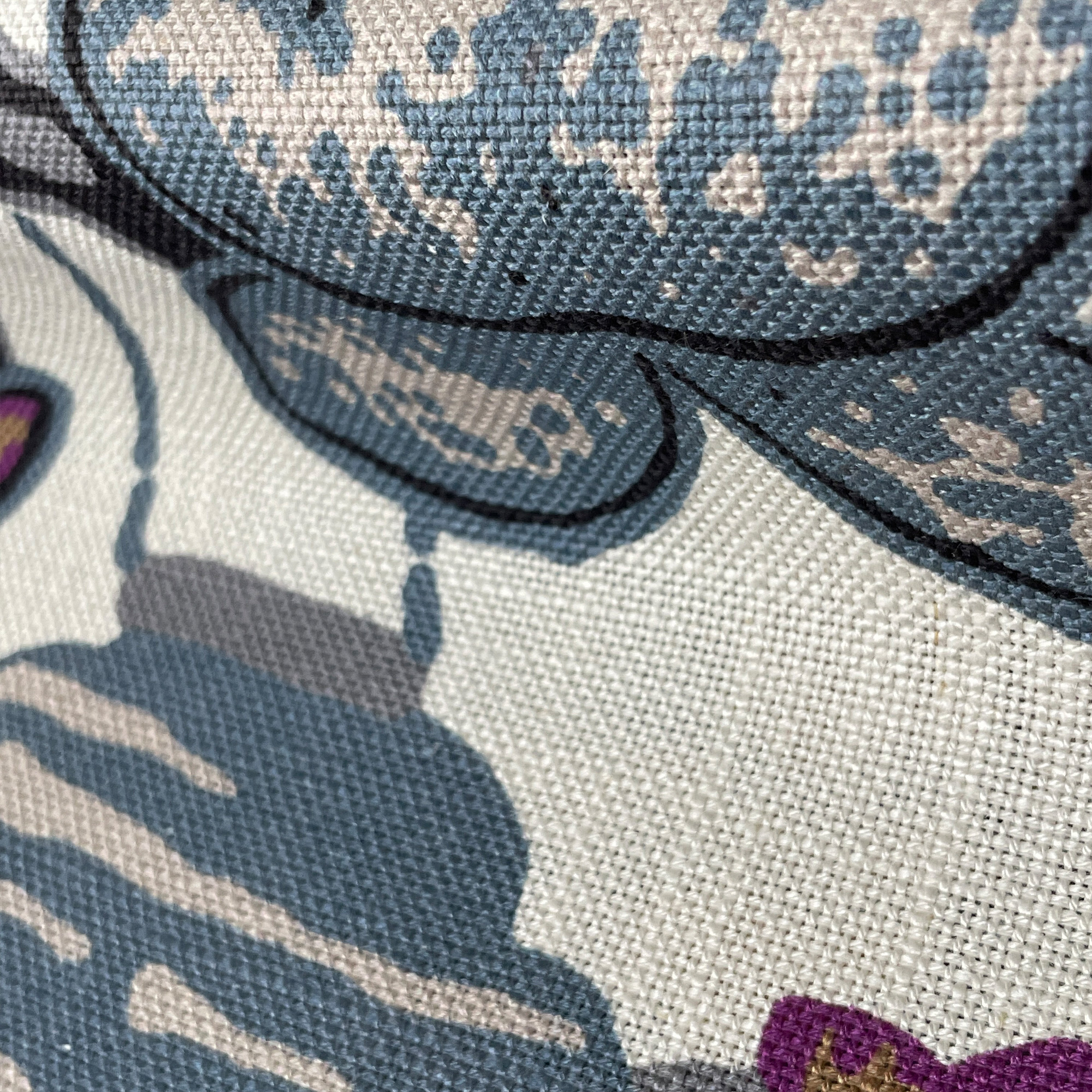 Das verspielte, asiatisch inspirierte Muster zeigt stilisierte Blüten, Laternen und ornamental wirkende Elemente, die sich in einem rhythmischen Rapport über die Fläche verteilen. Auf dem fein gewebten Stoff entfaltet sich eine harmonische Farbwelt aus Ocker, Ziegelrot, Blaugrau und sanften Naturtönen – kunstvoll und detailreich gedruckt.
