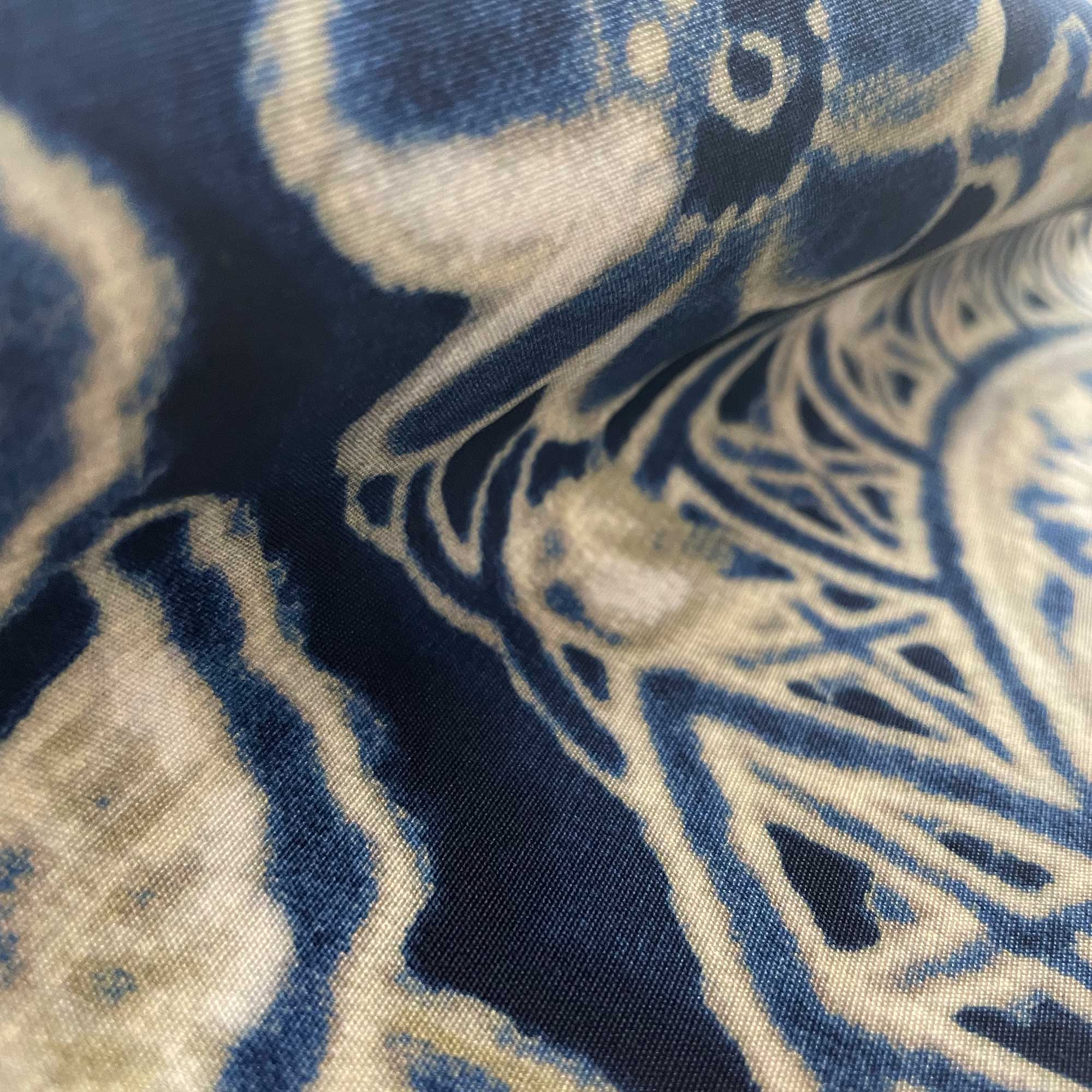 Inspiriert vom ikonischen "Blue Willow"-Muster, das man von klassischem Porzellan kennt, erzählt das aufwendig gestaltete Motiv von fernöstlichen Landschaften, Pagoden, Brücken und blühenden Gärten. Gedruckt auf reiner Baumwolle, entfaltet das Design eine besondere Tiefe und zeitlose Ästhetik. Die elegante Farbkombination sorgt für ein harmonisches Wohnambiente – unabhängig vom Einrichtungsstil.