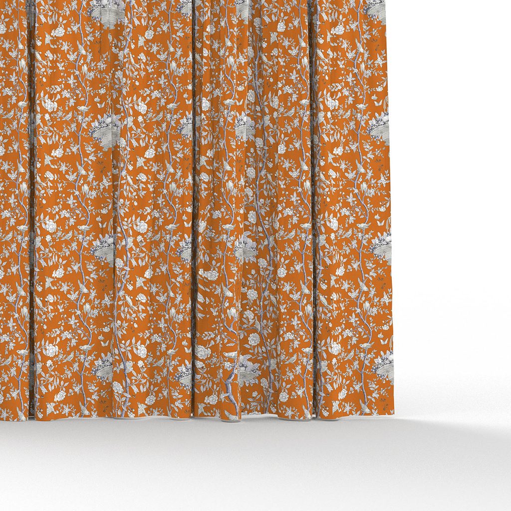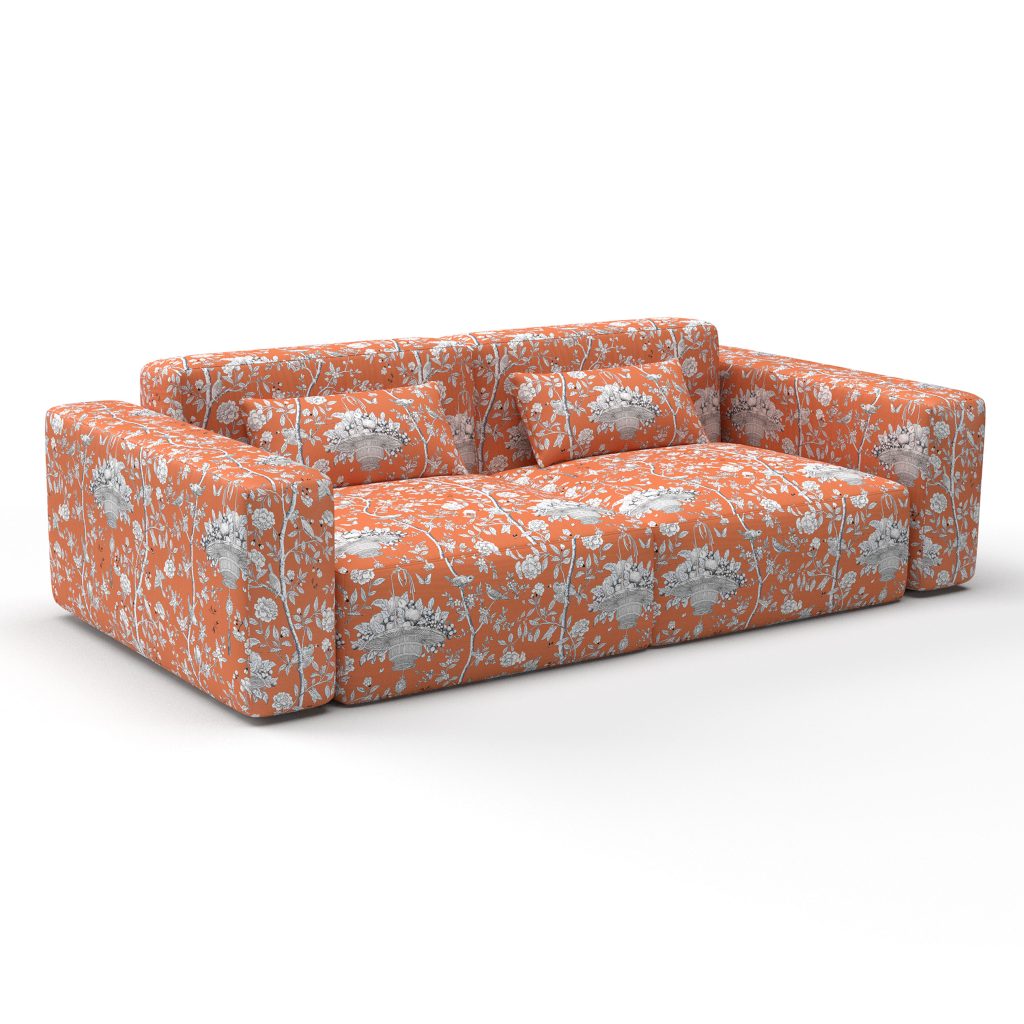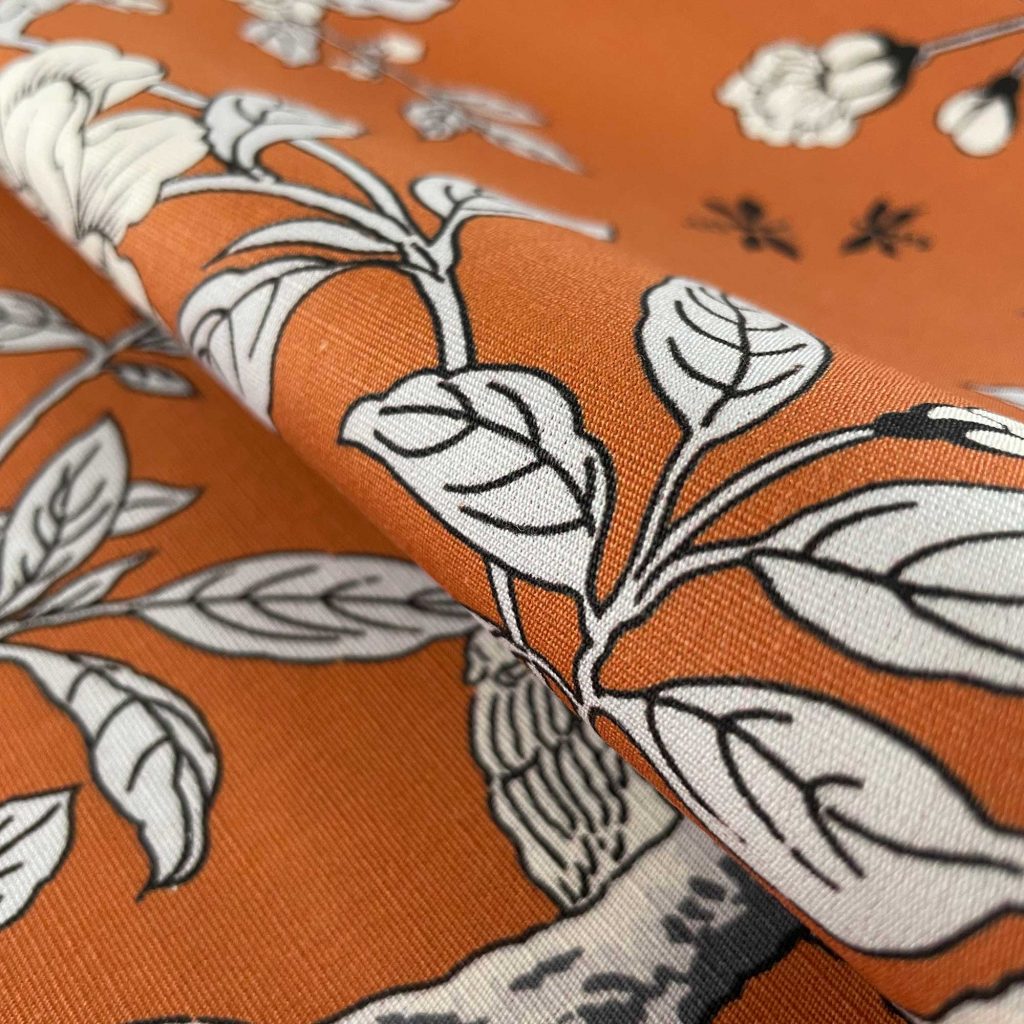 Der Stoff besteht aus 61 % Baumwolle und 39 % Leinen – eine edle Materialmischung, die sowohl haptisch als auch optisch überzeugt. Kunstvoll bedruckte Blumenkörbe und rankende Pfingstrosen verleihen dem Design eine zeitlose Ausstrahlung, die sowohl klassisch als auch modern interpretiert werden kann.