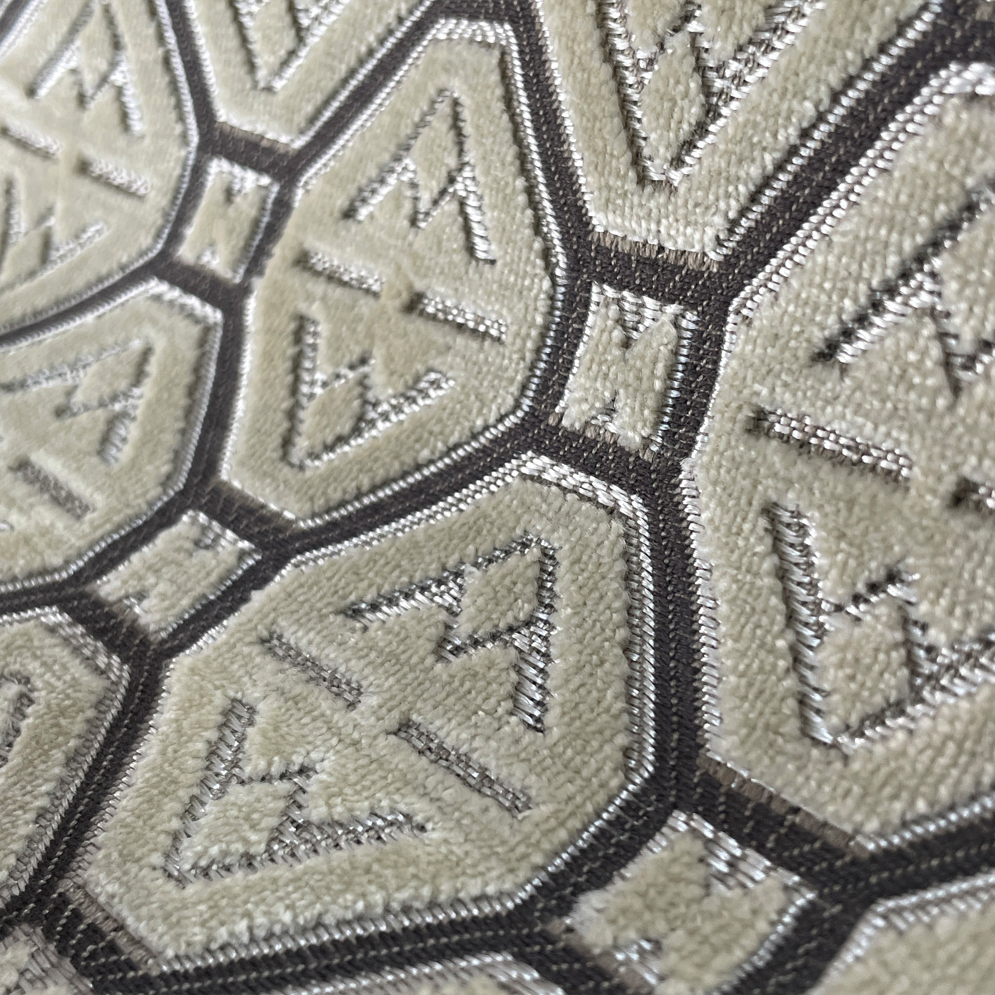 Der Stoff Calabrez von Lorenzo Castillo ist ein luxuriöser Deko- und Polsterstoff, der durch seine aufwendig gewebte geometrische Struktur Tiefe und Eleganz erzeugt. Die fein abgestimmten Garnfarben verleihen dem edlen Viskosesamt eine besondere Brillanz. Exklusiv erhältlich bei Villakontor® online.