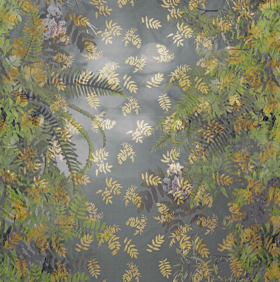 Textile key to an enchanted garden. The opulent decorative fabric scatters shiny leaf motifs on its diffuse background with an almost photorealistic look. In keeping with the collection's motto, the viewer is taken on a "ramble" through the magical natural scenery. They can choose between four color worlds corresponding to the seasons - from the soft green of spring to the warm colors of summer to the earthy copper scale of autumn and the silvery hoarfrost of winter.