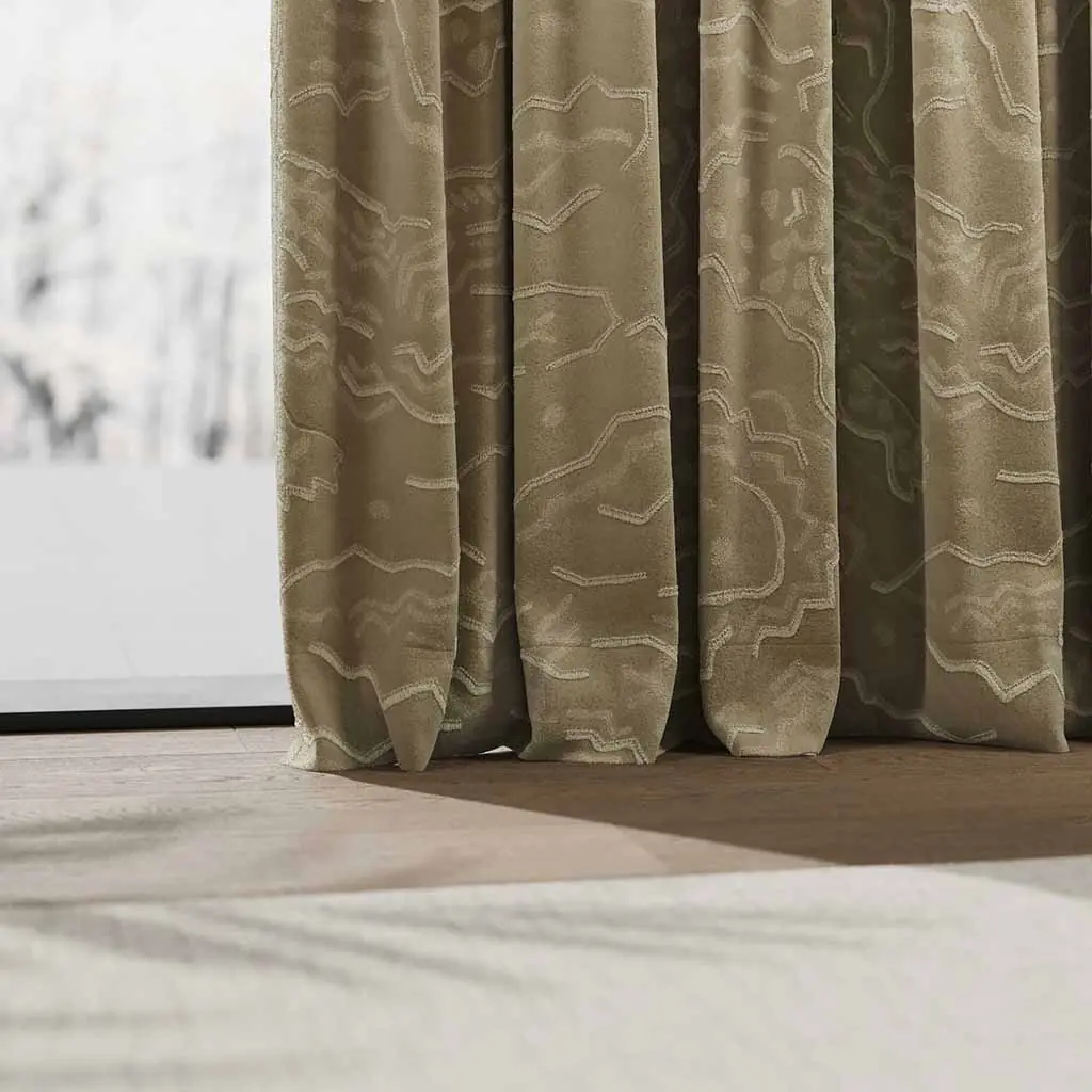 Das abstrakte Stickmuster mit Scherli-Effekt verläuft über einen eleganten Veloursfond und erinnert an vibrierende Tonfrequenzen im Raum. Durch das Zusammenspiel aus mattem Grundgewebe und schimmernder Stickerei entsteht eine lebendige Oberflächenstruktur mit besonderer Tiefenwirkung.