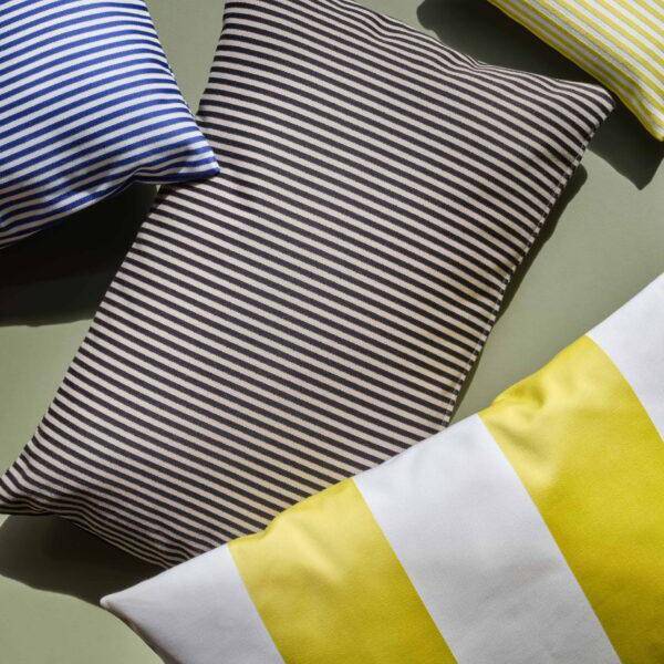 Das Design basiert auf feinen 0,5 cm breiten Webstreifen, die sich klar und präzise vom strahlend weißen Hintergrund abheben. Diese Kombination sorgt für eine frische, leichte Optik und verleiht dem Stoff eine besonders elegante Wirkung.