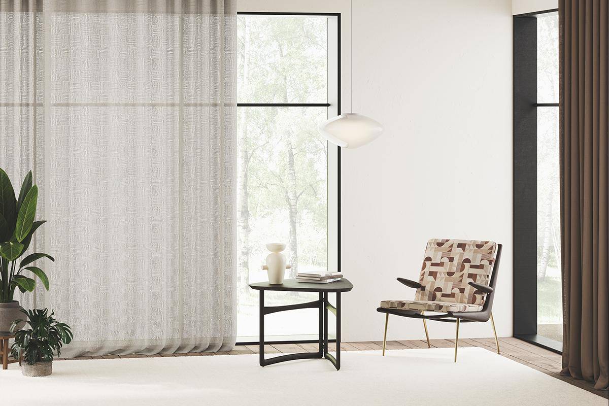 Sophisticated threading. The unique appearance of Yoko is the result of the sophisticated interplay of woven weave and exclusive finishing. A trick that allows the high-quality Belgian linen to contract in a controlled manner, giving its semi-transparent checkerboard pattern a wavy effect. Used in large format in double width, the fine-threaded fabric is reminiscent of Japanese paper walls and also radiates their puristic balance. In natural ivory, sand or silver tones, it brings meditative calm to the interior.