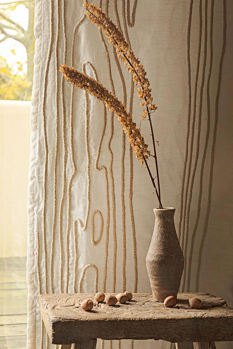 Stoffzusammensetzung: 63 % Leinen, 17 % Baumwolle, 12 % Polyester, 3 % Viskose, 3 % Polyamid, 2 % Acryl. Die Mischung aus natürlichen und technischen Fasern verleiht dem Stoff Festigkeit, Formbeständigkeit und eine einzigartige Textur. Handstickereien machen Akio zu einem exklusiven Dekorationsstoff, der seine Ausdruckskraft und Schönheit über viele Jahre hinweg bewahrt. Der Stoff eignet sich ideal für die Herstellung von Vorhängen, Dekorationspaneelen, Kissen und Akzentelementen und erfüllt den Innenraum mit der Wärme und Eleganz natürlicher Materialien.