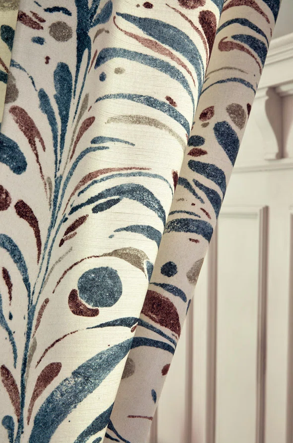 Der Pierre Frey Marmor Vorhängstoff vereint außergewöhnliche Qualität, künstlerischen Stil und natürliche Eleganz. Das Material zeichnet sich durch seine Strapazierfähigkeit und seine besondere Textur aus. Malerische Motive, die aus tropfenförmigen, in Streifen angeordneten und auf Leinen gedruckten Mustern bestehen, bilden eine harmonische Komposition in Blau- und Holztönen. Dadurch ist dieser Stoff ideal für klassische und minimalistische Interieurs.