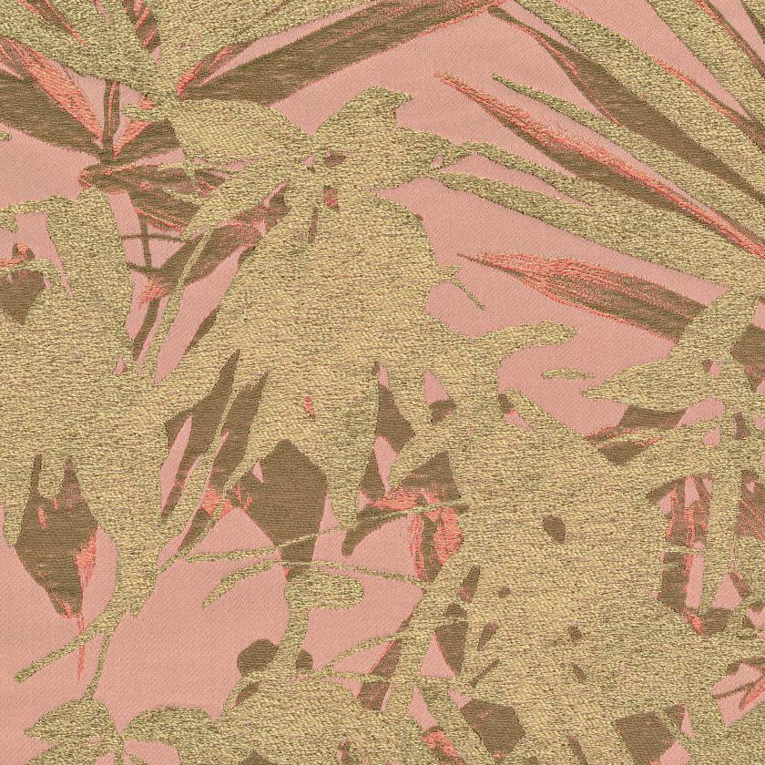 Java von Rubelli Venezia ist ein Spiel mit Licht und Schatten, mit der Überlagerung von glänzenden und matten Silhouetten, das an japanische Lacke erinnert. Pflanzliche Elemente mit anmutigen Formen, möglicherweise Kentia-Palmen, heben sich leuchtend im Vordergrund ab. Für den Einsatz bei Licht geeignet.