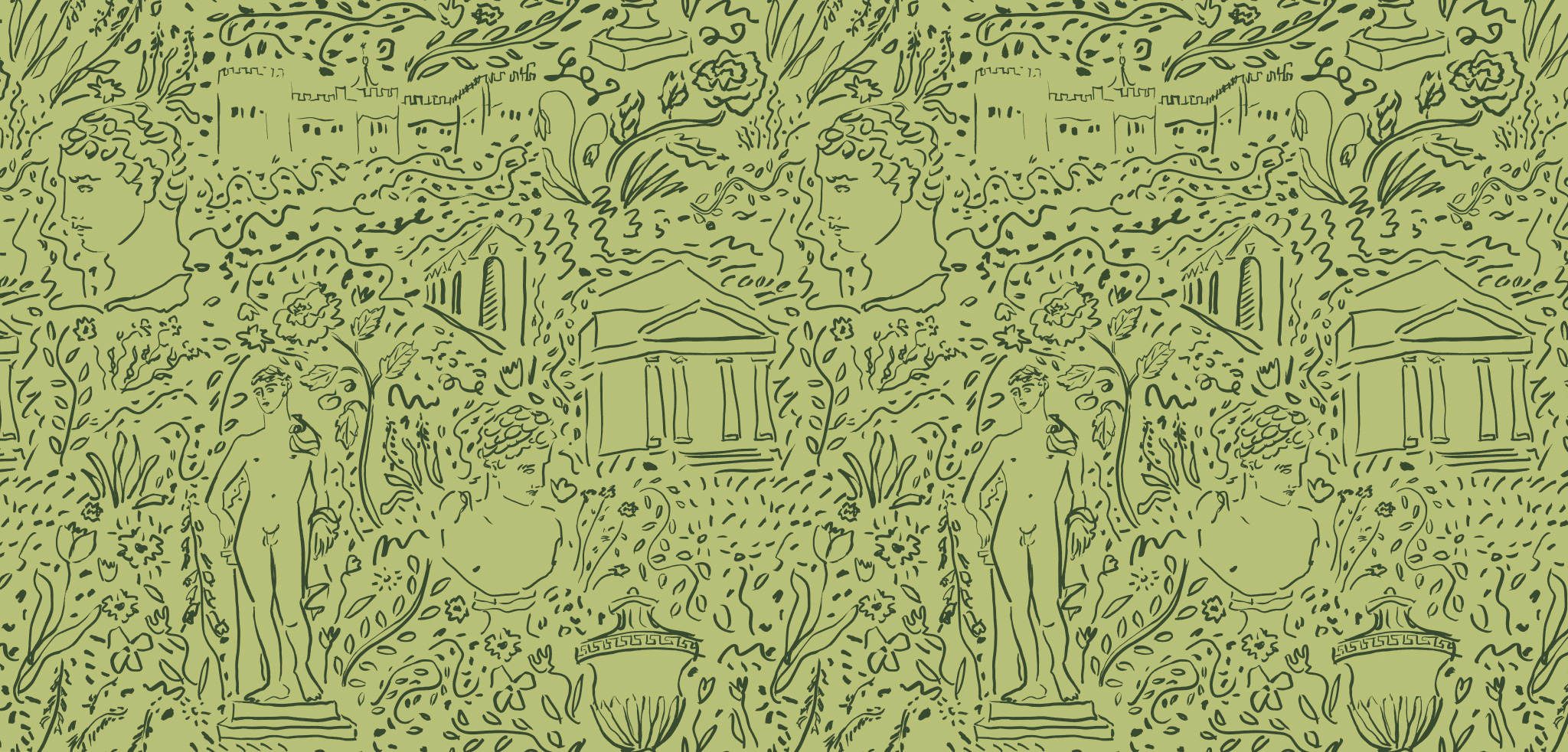 Skizzen eines arkadischen Gartens, inspiriert durch das wunderbare Rousham House and Gardens, Oxfordshire. Ich besuche diesen Garten in meiner Nähe auf dem Lande so oft ich kann. Es ist ein klassisches Paradies, eine geheimnisvolle und antik anmutende Landschaft mit Grotten, Teichen und bröckelnden Statuen. Druck auf einem Leinen- und Baumwollgrund. Geeignet für Polstermöbel.