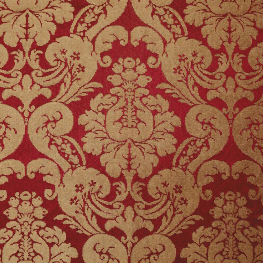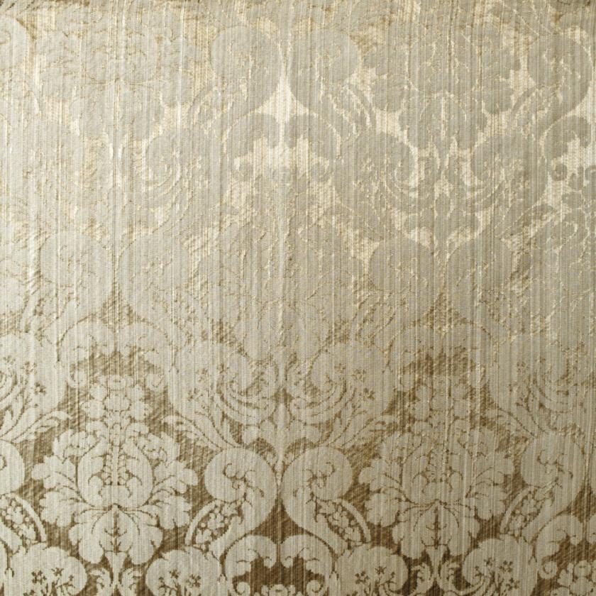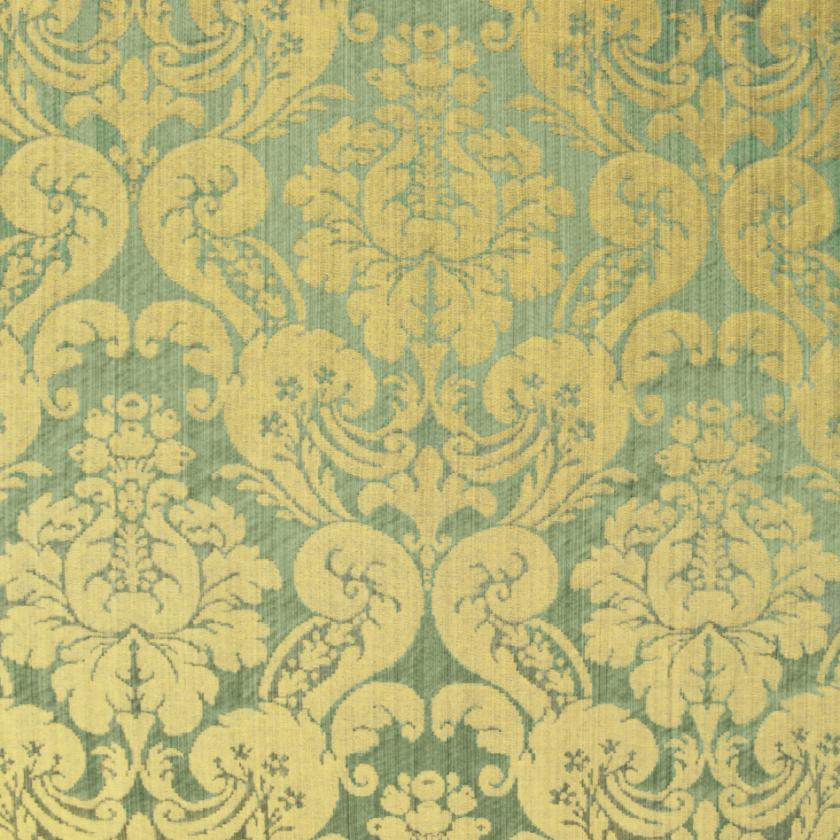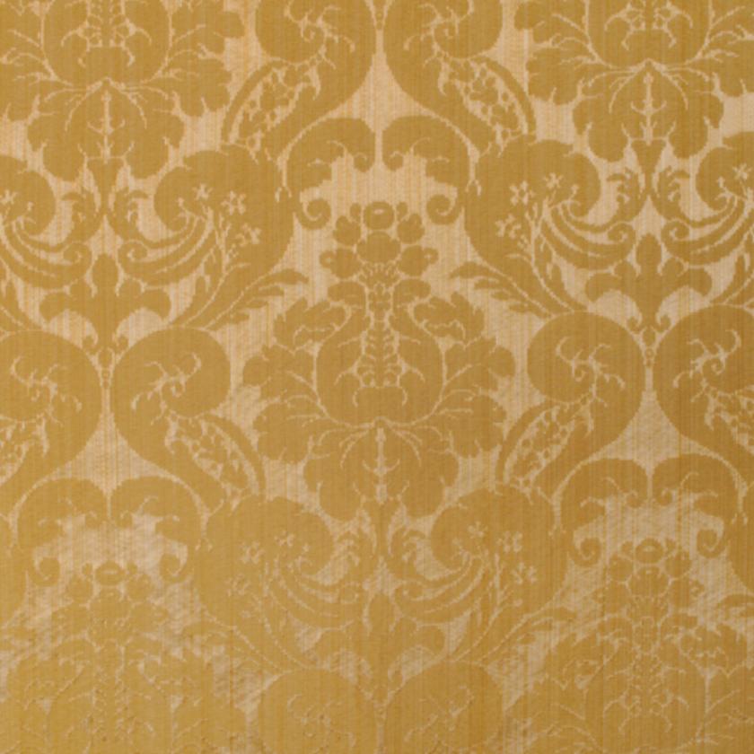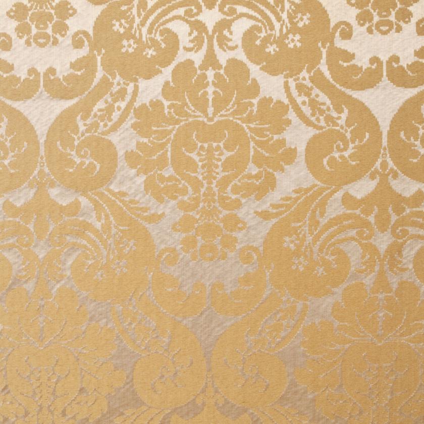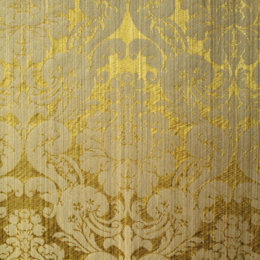 Ruzante aus dem traditionellen Hause Rubelli Venezia. Seide mit einem eleganten, von Strié-Effekten geprägten Hintergrund, auf dem Blumen- und reiche Laubdekorationen raffinierte Spitzbogenformen bilden. Bei diesem zweifarbigen Damast hebt sich die Arbeit dank der Verwendung von glänzendem Leinen und Acetat-Schussfäden vom Hintergrund ab: Gerade die Eigenschaften der Kett- und Schussfäden verleihen dem Gewebe ein besonderes und kostbares Licht. Die Palette besteht aus nicht weniger als 13 Farben, die von Grün über Goldtöne bis hin zu Neutraltönen reichen.
