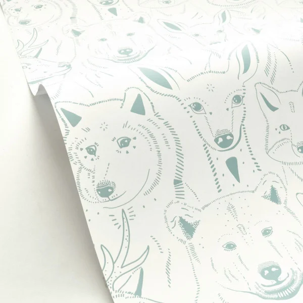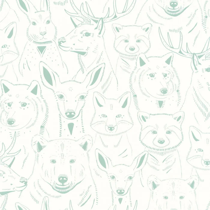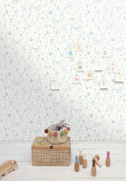 Eine elegante Tapete mit den Tieren des Waldes ist ein fantasievolles und poetisches Versteckspiel. Wählen Sie dazu einen schlichten weißen oder schicken grün-grauen Hintergrund.