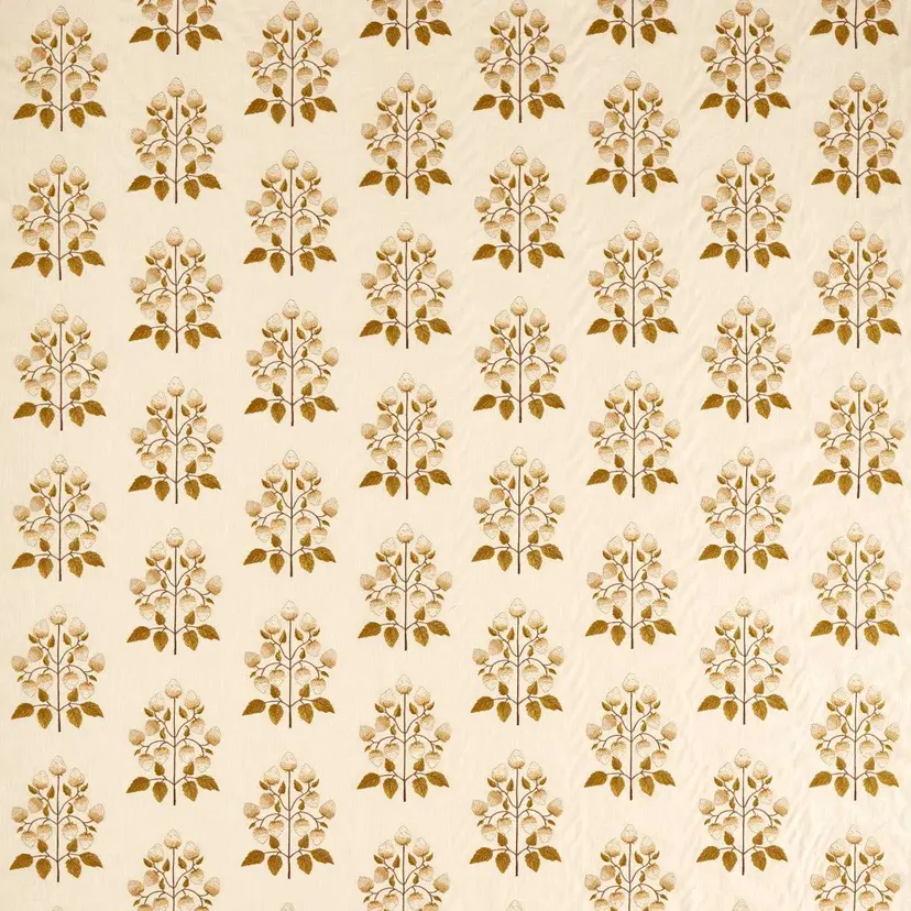 Der Goldings Hops Polsterstoff von Sanderson vereint kunstvolle Handwerkskunst mit moderner Langlebigkeit. In einem eleganten, einzeiligen Stickmuster wachsen Hopfenblüten harmonisch an Bäumen empor. Das Design wurde im Atelier inspiriert von den Obstgärten und der Butterei des Brockhampton Estate gemalt und anschließend als feines Stickmotiv umgesetzt.