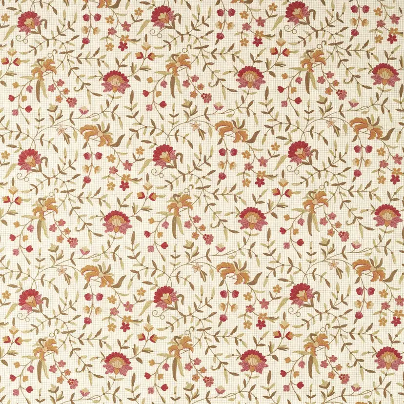 Das jakobinische Blumenmuster erhält durch eine feine Gitterstickerei eine subtile, tonale Dynamik. Dadurch wirkt der Stoff lebendig, ohne aufdringlich zu sein, und fügt sich harmonisch in klassische wie moderne Interieurs ein.