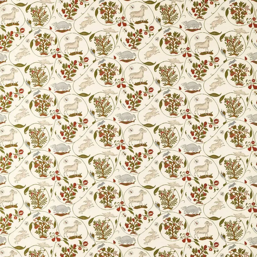 Der Lost Orchard Polsterstoff von Sanderson lässt historische Obstgärten und ihr verspieltes Wachstum in Ihr Zuhause einziehen. Inspiriert von der Restaurierung der Brockhampton-Obstgärten durch den National Trust, zeichnet der Jacquard-Stoff die gewundenen Pfade, Bäume, Vögel, Dachse und Schafe des Anwesens nach. Das teppichartige Gewebe erinnert an mittelalterliche Stickmuster und Randnotizen, wirkt verspielt und naiv zugleich und vermittelt eine Vogelperspektive auf die sanften Kurven des Gartens.