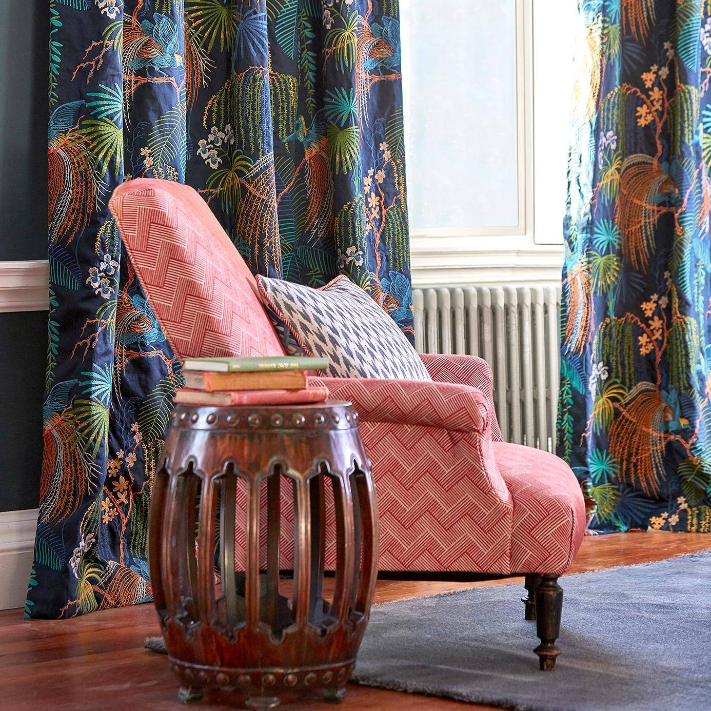 Der Stoff „Rain Forest Embroidery“ von Sanderson besteht aus 70% Baumwolle und 30% Polyester und hat eine Breite von 129 cm. Er eignet sich für Vorhänge, Jalousien und Dekokissen und vereint Natürlichkeit und Strapazierfähigkeit.