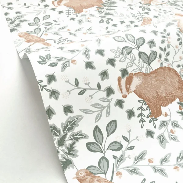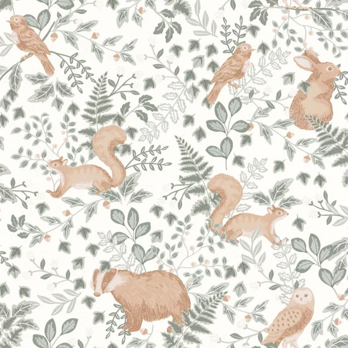 Ein Gruß an die Liebhaber der Wälder! Kleine Eichhörnchen, Eulen und andere Kreaturen erobern die Wanddekoration für eine Tapete in Pastellfarben, die von den skandinavischen Ländern inspiriert sind.