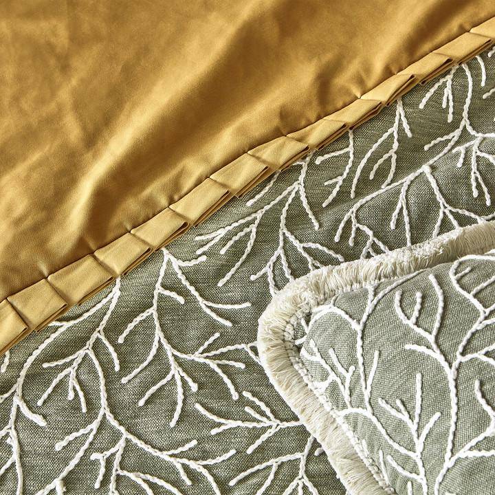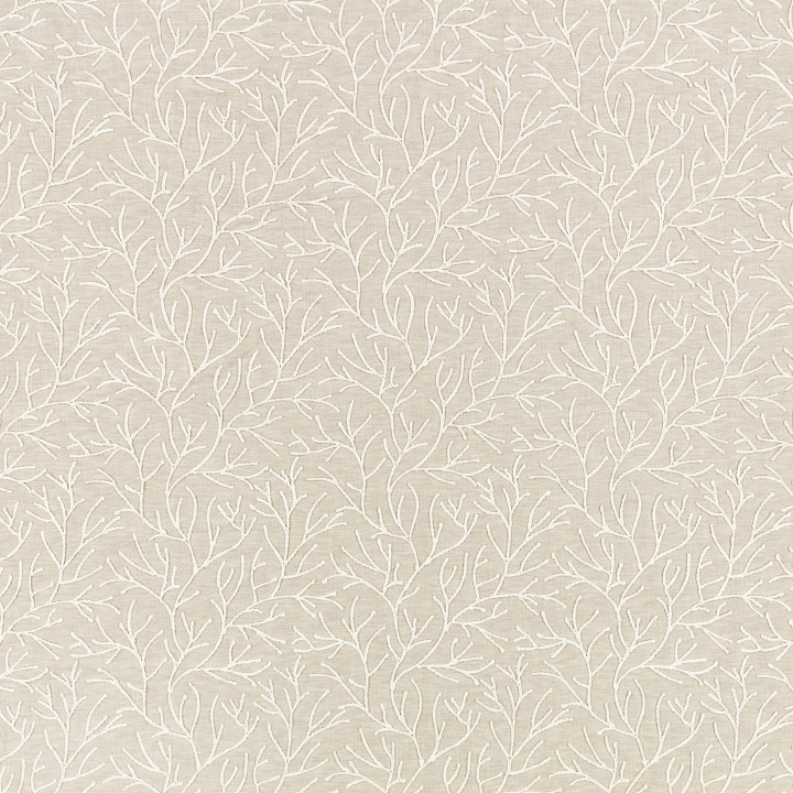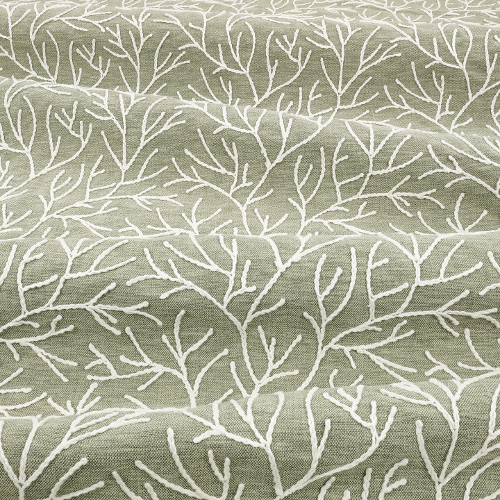 Cerelia wirkt wie eine traditionelle Kreppstickerei, da die Stickerei auf dem sanft strukturierten Stoff liegt. Die Kordelstickerei umreißt wuchernde Wedel und präsentiert sich in einer Palette mit Tiefe, da sich vielseitige Neutraltöne mit einem erdigen Grün und einem tiefen Blau abwechseln.