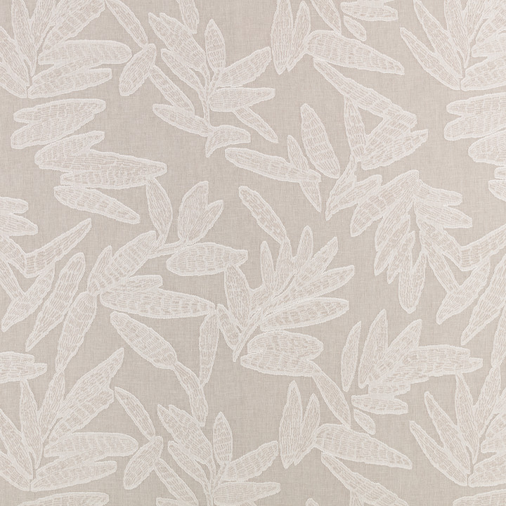 Ein besonderes Merkmal von Elira sind die dekorativen Blätter mit filigraner Fil Coupé-Technik, die der Oberfläche taktile und visuelle Tiefe verleihen. Dieser transparente, doppelt breite Stoff eignet sich perfekt für Gardinen, lichtdurchlässige Vorhänge und Dekorationselemente.