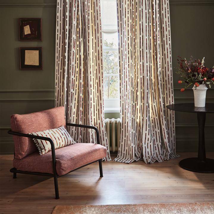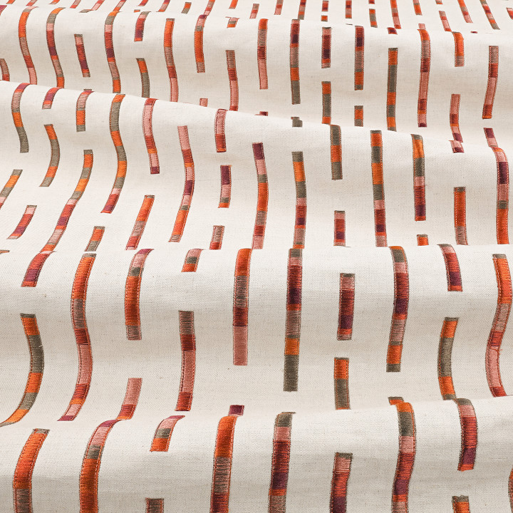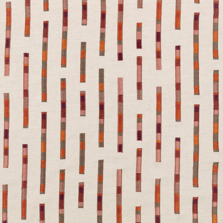 Inspiriert von der authentischen Natur der im Garten gepflückten Blumensträuße, präsentiert Abloom eine Vielzahl von äußerst charmanten, ausdrucksstarken Stickereistoffen. Bei Elwood bilden gestickte Linien in verschiedenen Längen und Farben eine elegante, geometrische Aussage in der Struktur eines Streifens auf einem subtil strukturierten Stoff.