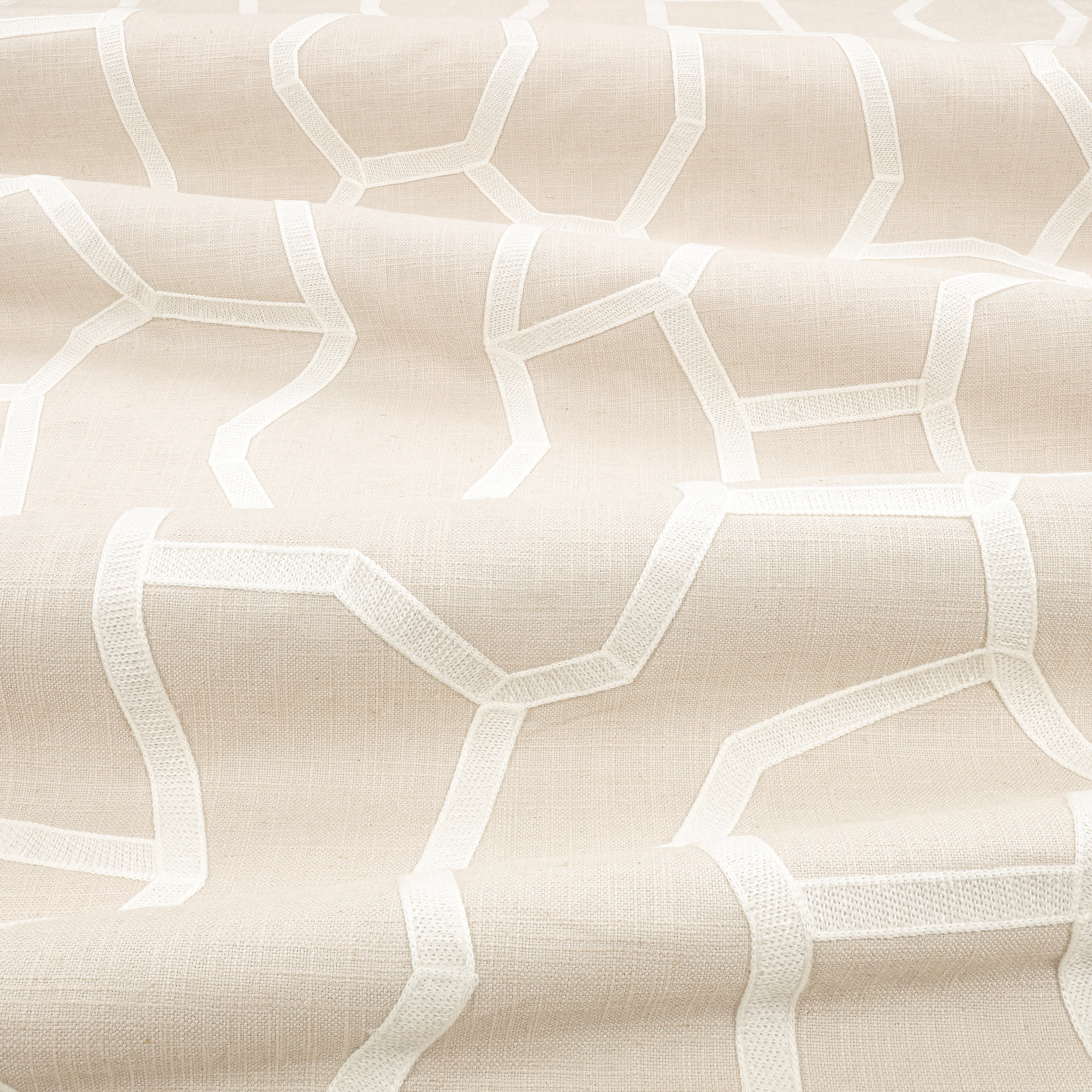 Der Samir Stoff von Villa Nova beeindruckt mit einem kunstvollen Design und einer hochwertigen Textilstruktur. Charakteristisch für diesen besonderen Dekorations- und Polsterstoff ist seine aufwendig gestickte geometrische Gestaltung, bei der ineinandergreifende Formen ein lebendiges Muster bilden.