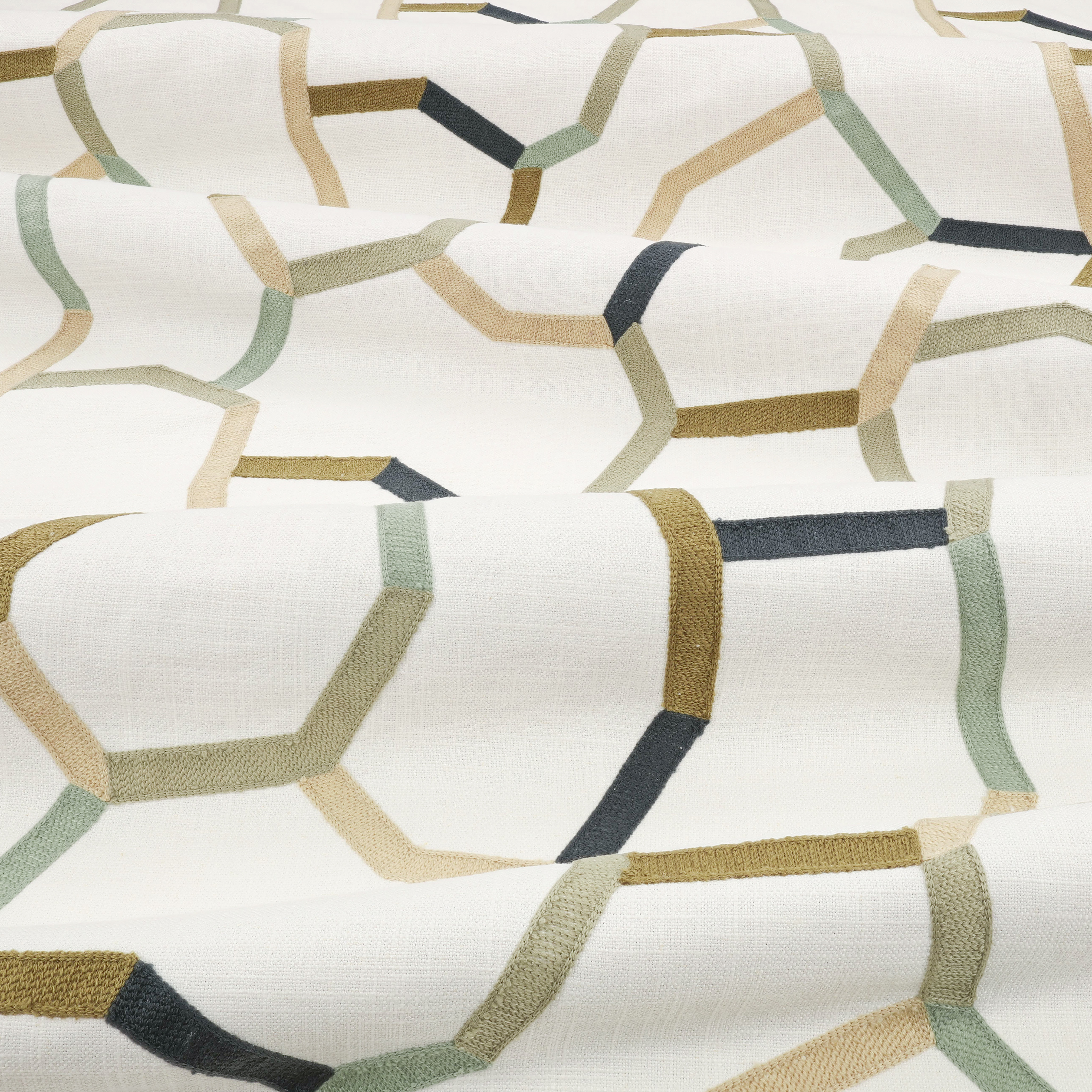 Der Samir Stoff von Villa Nova beeindruckt mit einem kunstvollen Design und einer hochwertigen Textilstruktur. Charakteristisch für diesen besonderen Dekorations- und Polsterstoff ist seine aufwendig gestickte geometrische Gestaltung, bei der ineinandergreifende Formen ein lebendiges Muster bilden.
