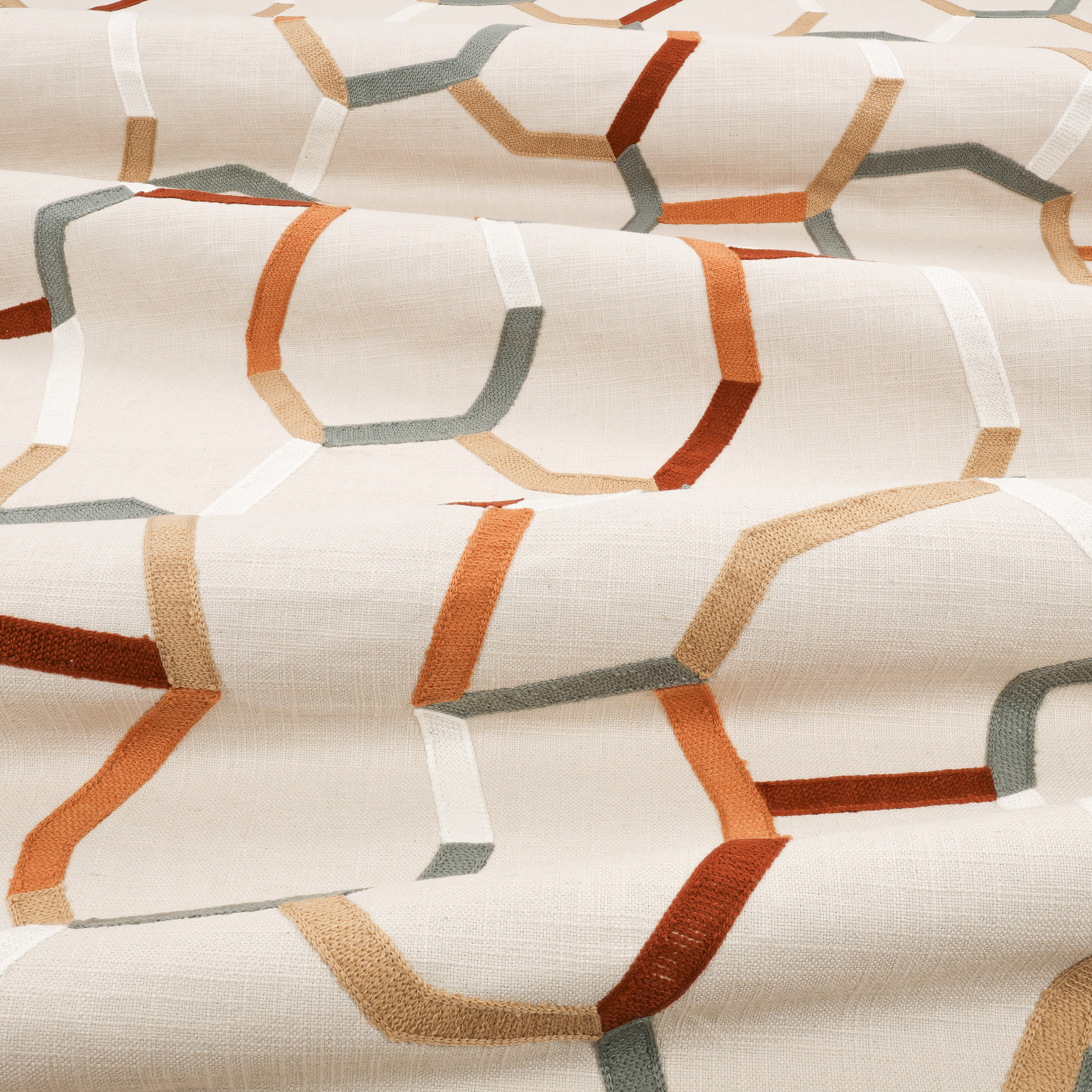 Der Samir Stoff von Villa Nova beeindruckt mit einem kunstvollen Design und einer hochwertigen Textilstruktur. Charakteristisch für diesen besonderen Dekorations- und Polsterstoff ist seine aufwendig gestickte geometrische Gestaltung, bei der ineinandergreifende Formen ein lebendiges Muster bilden.