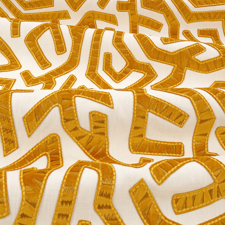 Arp von ZINC ist eine innovative Interpretation eines labyrinthartigen Musters, bei dem Streifen aus strukturiertem Samt mit Stickereidetails auf einen entspannten Leinengrund appliziert sind.