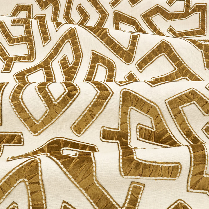 Arp von ZINC ist eine innovative Interpretation eines labyrinthartigen Musters, bei dem Streifen aus strukturiertem Samt mit Stickereidetails auf einen entspannten Leinengrund appliziert sind.