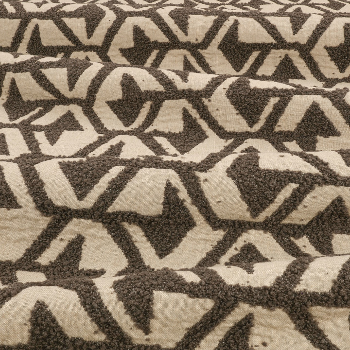 Der Deko & Polsterstoff Hex von ZINC ist ein stark strukturierter Wollbouclé erzeugt ein detailliertes, sechseckiges Muster auf einem Leinen-Taschengewebe mit einem sehr klobigen Griff. Diese rustikalen Qualitäten gipfeln in einem entspannten, handgefertigten Erscheinungsbild mit zufälligen Bouclé-Sprenkeln auf dem Leinengrund, was den Charakter des Stoffes nur noch verstärkt. Durch die Verwedung hochwergier Garne ensteht ein wundervoller schwerer Dekostoff mit Charakter und eine Statement für die Einrrichtung.