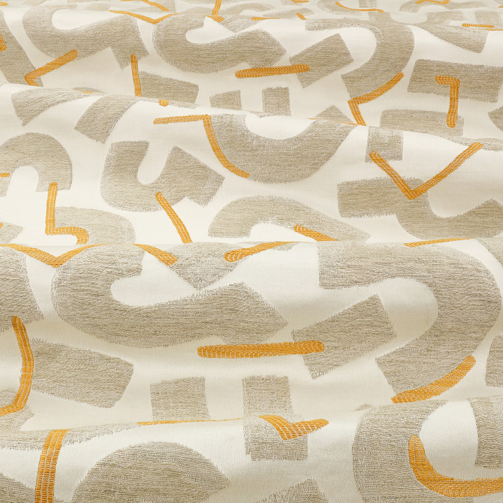 René von ZINC ist eine Karikatur geometrischer Formen stürzt über ein fließendes Baumwollleinen, mit schimmernden Intonationen von erdiger Farbe.