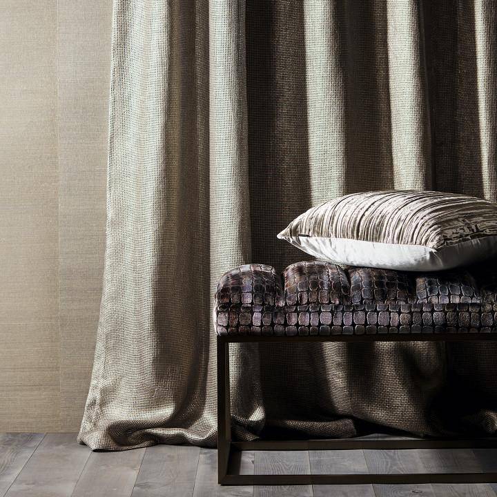 Sirocco by ZINC is a sophisticated, textured, open weave linen fabric with a foiled surface that creates a weathered patina.