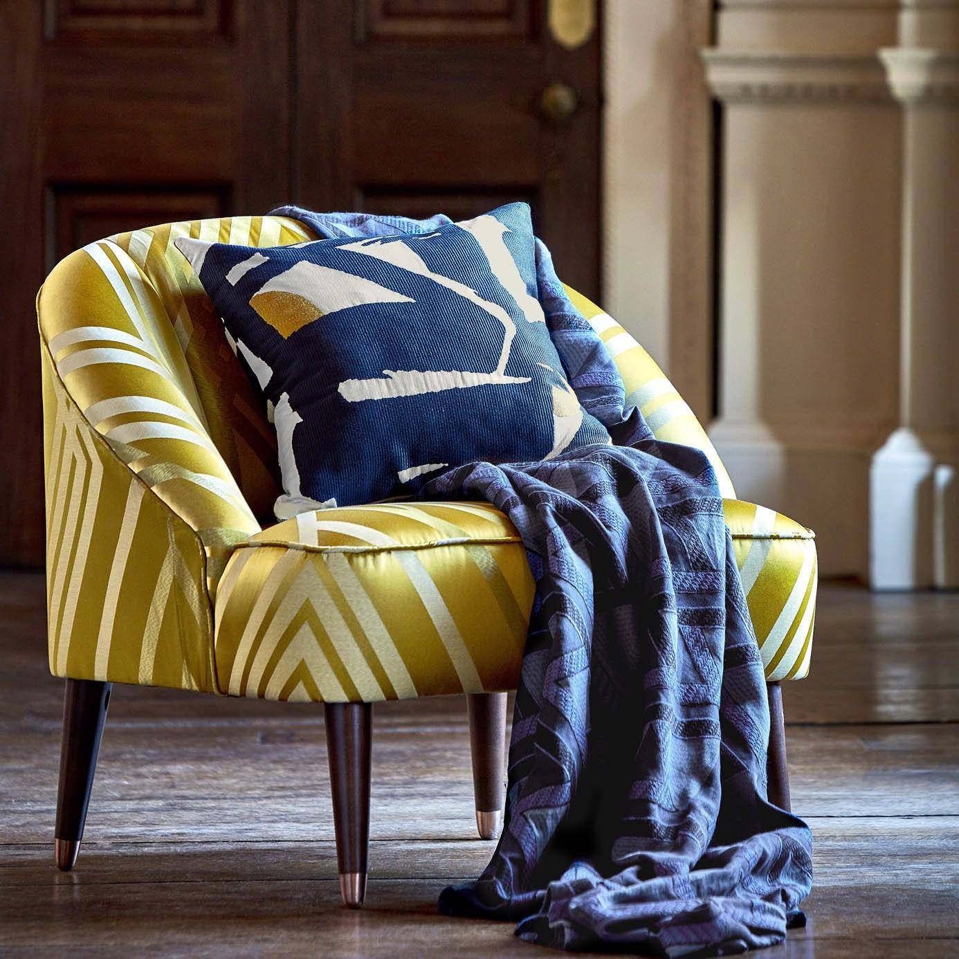 Der Dekostoff Geometrica von der Marke Zoffany ist für Vorhänge, Polsterungen, Kissen und andere dekorative Elemente im Innenraum geeignet. Hergestellt aus 48 % Baumwolle, 39 % Nylon und 13 % Viskose, mit einer Breite von 140 cm und einem Martindale-Wert von 100.000.