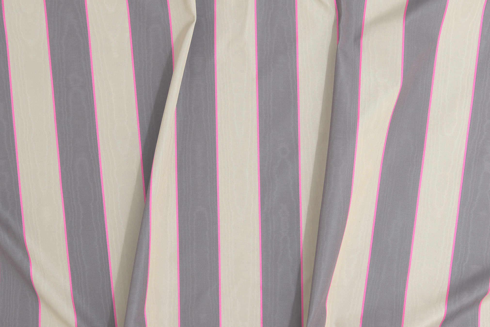 Adewisi ist ein eleganter Moiré in Trevira CS, der farblich auf den Uni Athenais abgestimmt ist und bei dem jeder Streifen sein eigenes Moiré-Design hat. Der dekorative Blockstreifen zeigt dabei das grosse Können eines Handwerkbetriebs, der als einer der letzten historischen Manufakturen noch immer auf alten Maschinen produziert. Die wasserzeichenartige Maserung eines echten Moirés entsteht, indem Stoffbahnen mit einem Kamm vorbehandelt und unter hohem Druck auf einem Walzenkalander laufen gelassen werden. Die besondere Raffinesse von Christian Fischbachers Adewisi ist, dass jeder Streifen sein eigenes Moiré-Design hat. Hierfür hat der italienische Hersteller einen speziellen Kamm entwickelt.