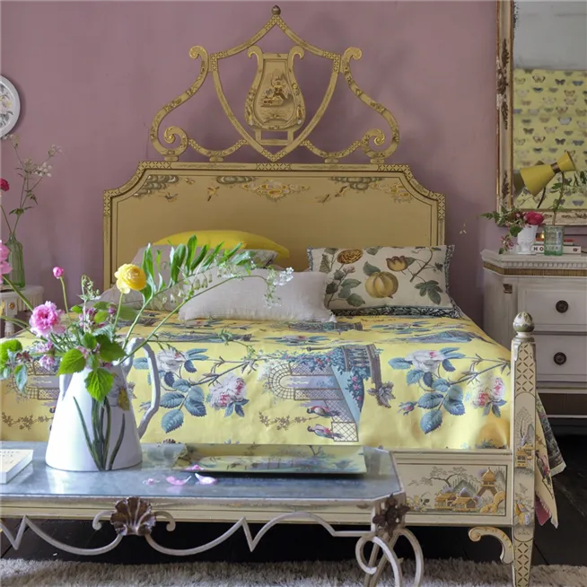 Das fröhliche Design stammt aus den Archiven von John Derian und zeigt stilisierte Rosen, elegante Vögel sowie kunstvoll arrangierte Blätter. Durch den präzisen Digitaldruck auf einem leicht strukturierten Baumwollstoff entfalten die Motive ihre volle Wirkung und verleihen dem Stoff eine besondere Tiefe.