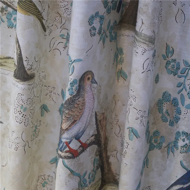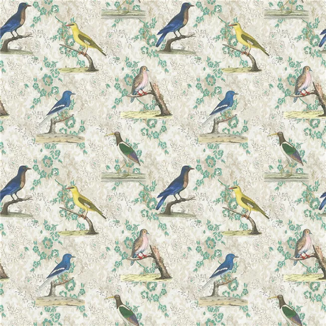 Die filigranen Vogelillustrationen stammen aus Fragmenten einer historischen Vintage-Tapete und wurden kunstvoll neu interpretiert. Der präzise Digitaldruck auf einem waschbaren Baumwollstoff lässt die feinen Details besonders lebendig erscheinen und verleiht dem Stoff eine elegante, zeitlose Ausstrahlung.