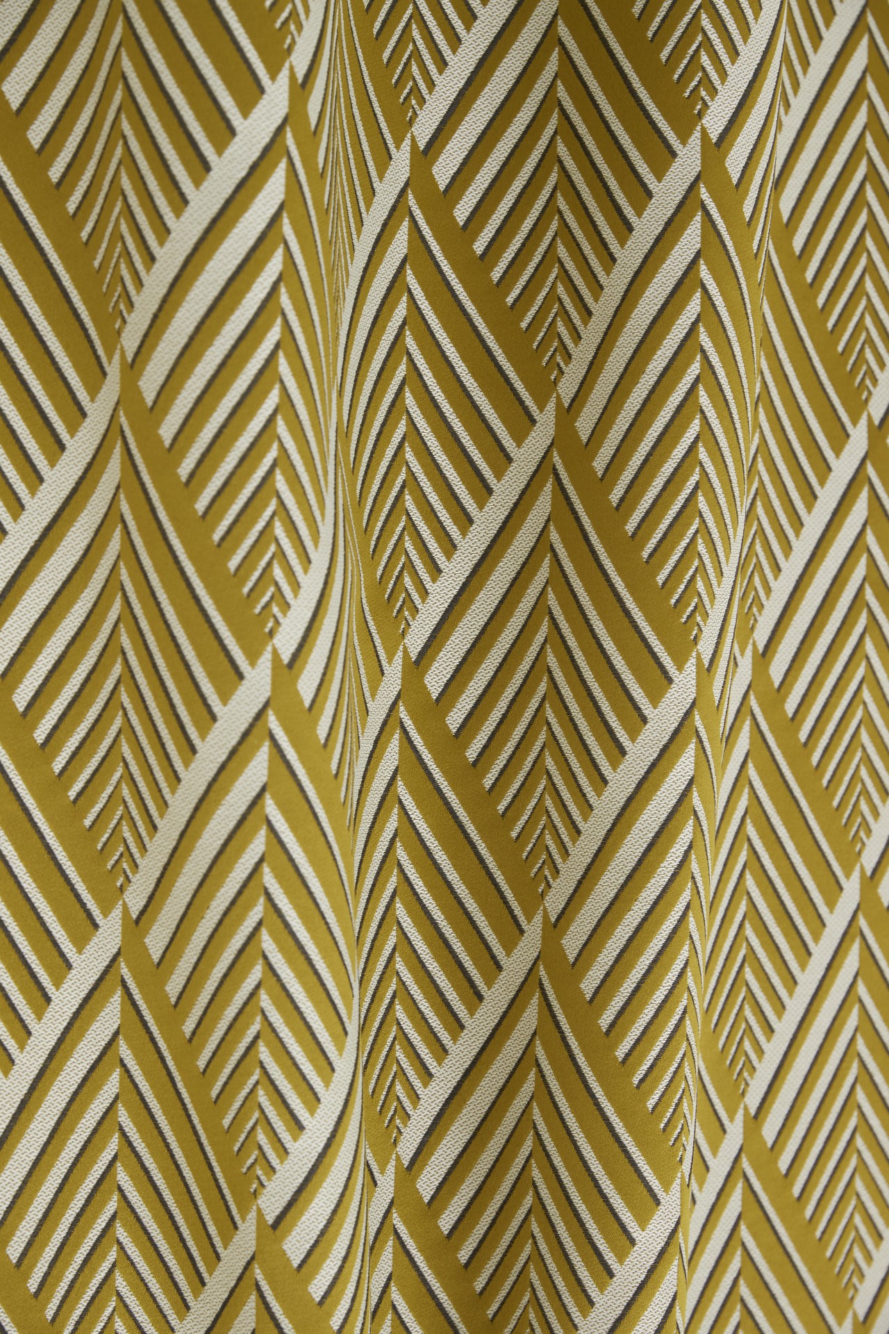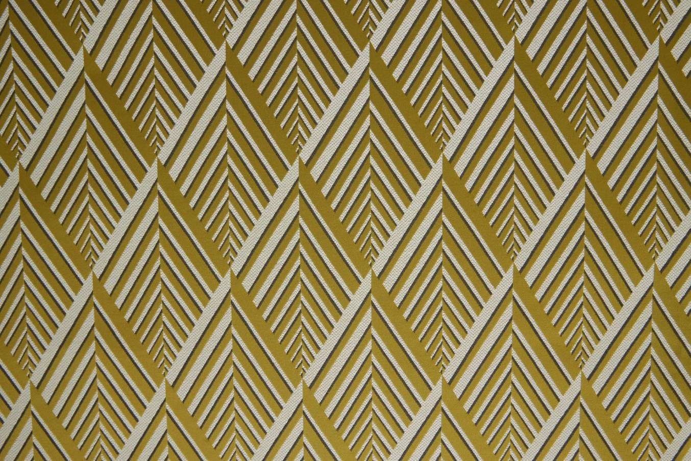 Der dekorative und Polsterstoff Ariane der Marke Lelievre Paris zeigt ein beeindruckendes geometrisches Muster aus Rauten mit Streifen in drei Farben auf leicht satinartigem Hintergrund. Der Stoff erzeugt einen rhythmischen Kontrast der Texturen, verstärkt durch eine dunkle Linie als Schatteneffekt, die Tiefe und Ausdruck verleiht.