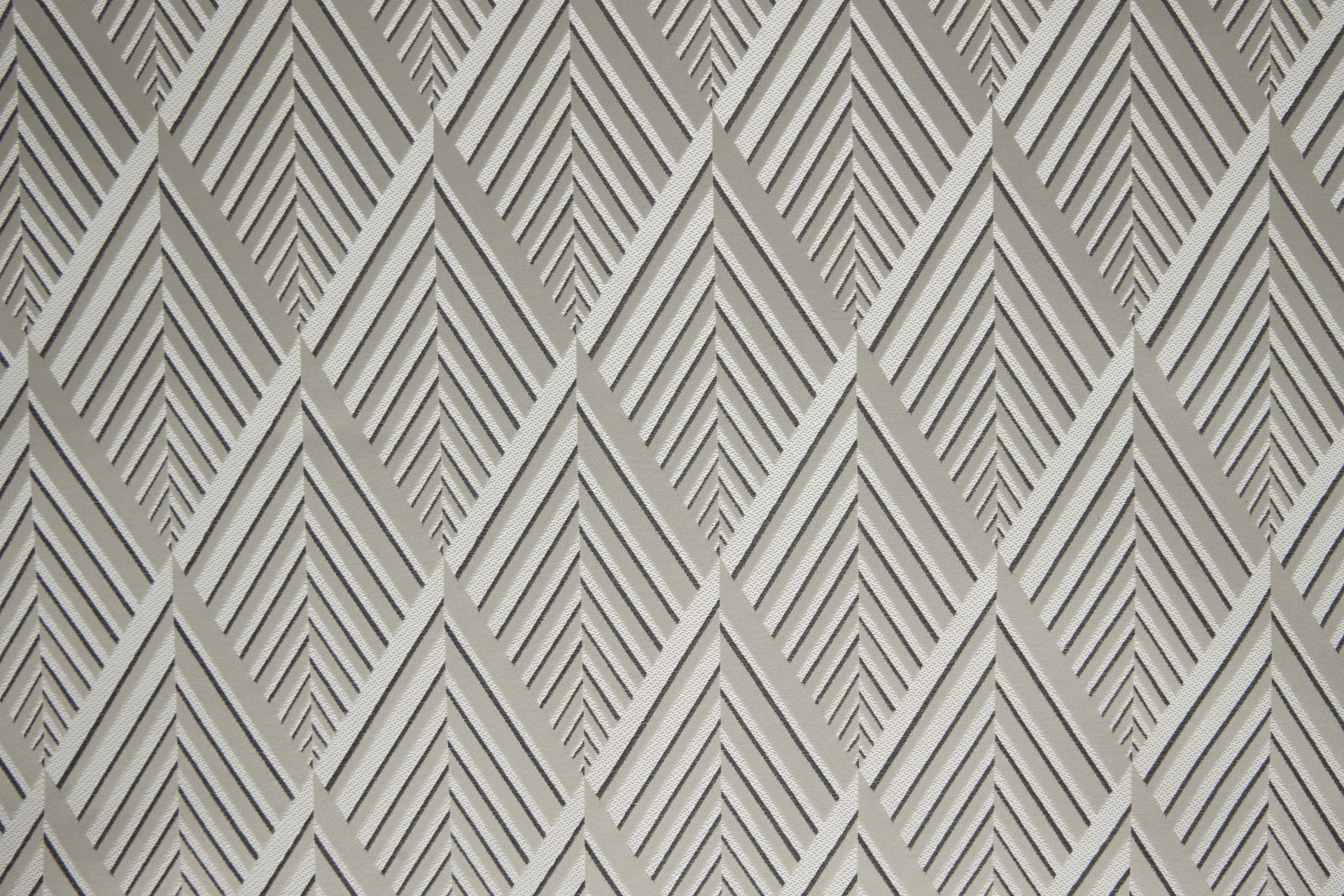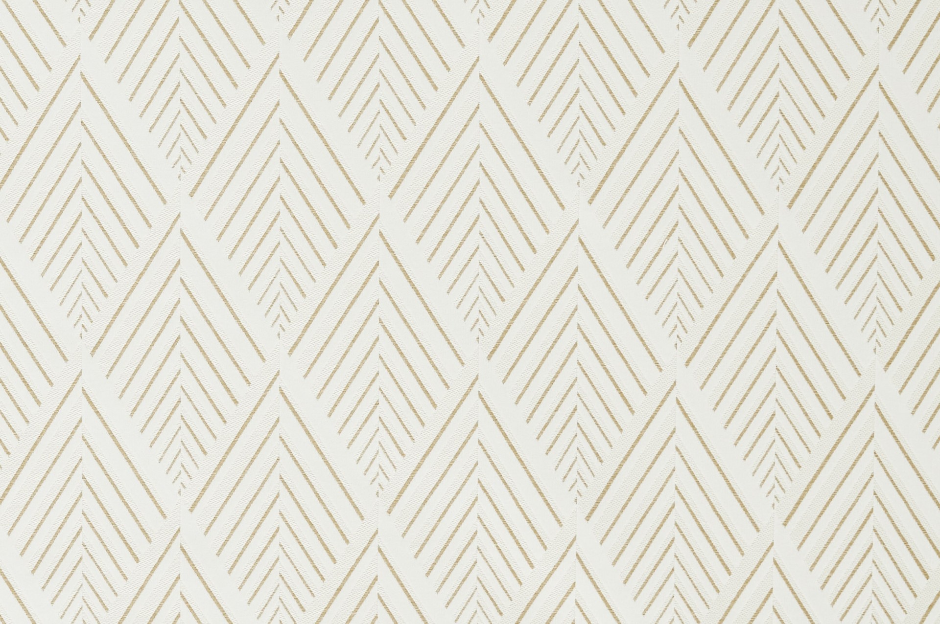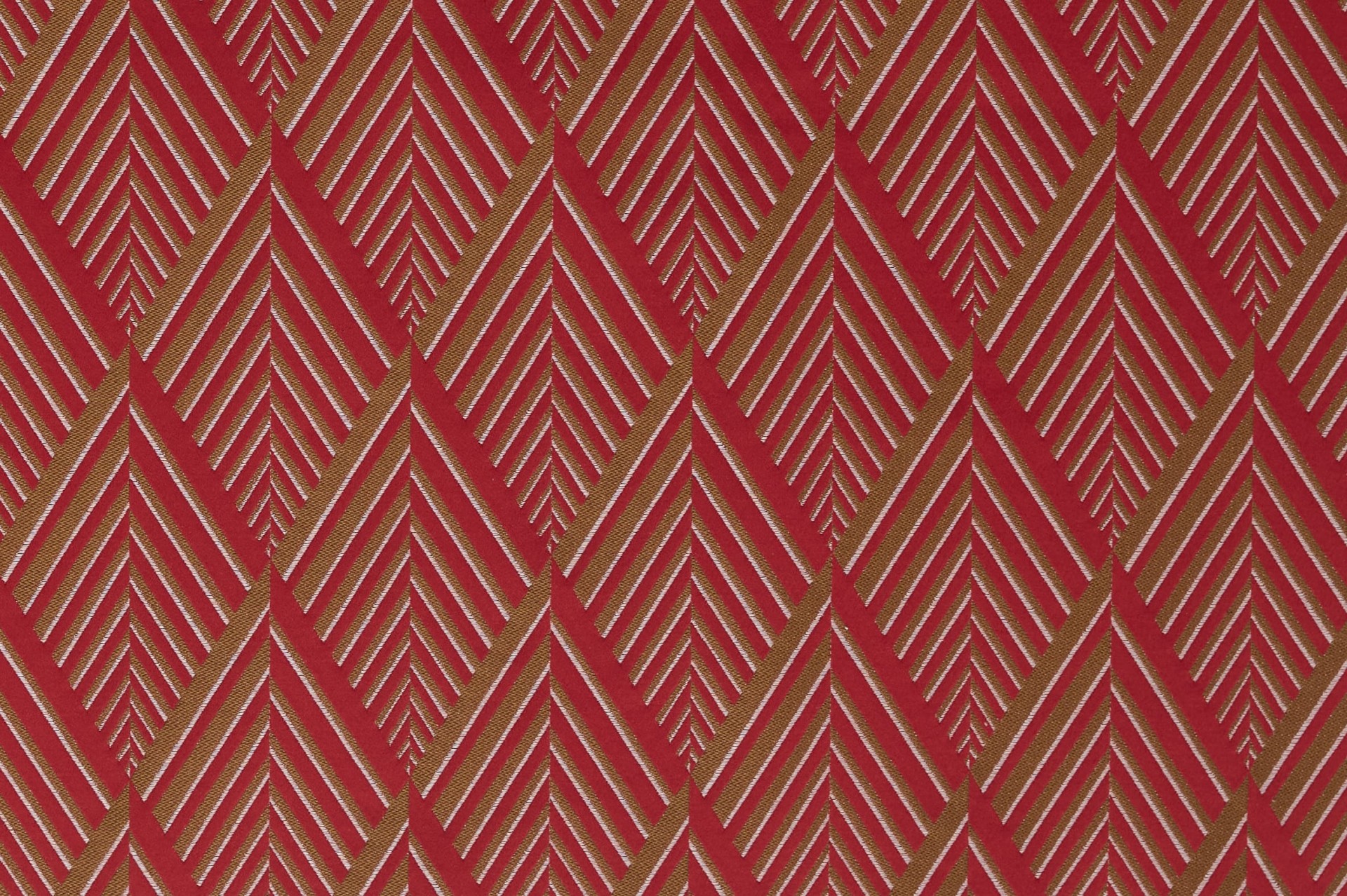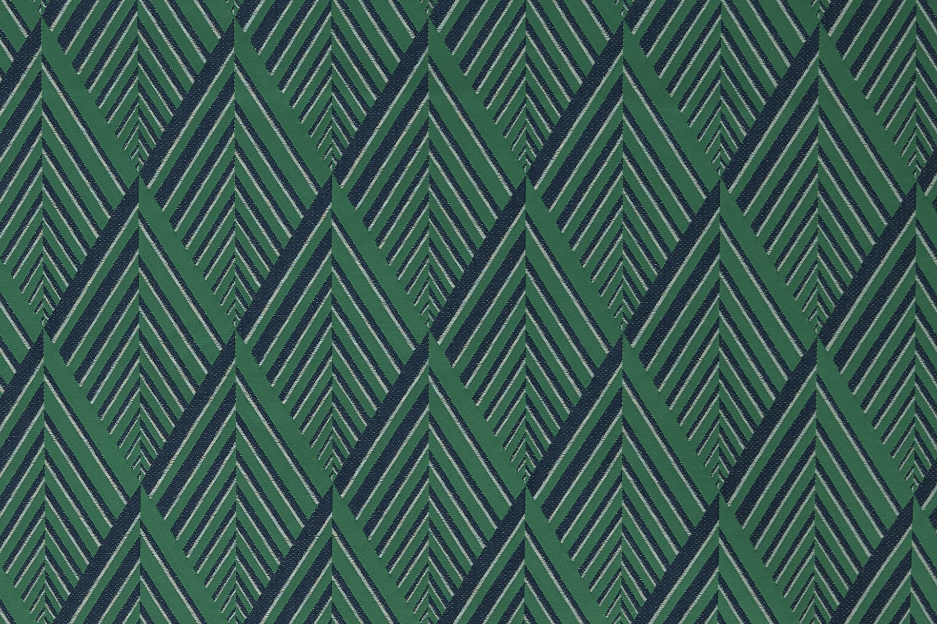 Der dekorative und Polsterstoff Ariane der Marke Lelievre Paris zeigt ein beeindruckendes geometrisches Muster aus Rauten mit Streifen in drei Farben auf leicht satinartigem Hintergrund. Der Stoff erzeugt einen rhythmischen Kontrast der Texturen, verstärkt durch eine dunkle Linie als Schatteneffekt, die Tiefe und Ausdruck verleiht.
