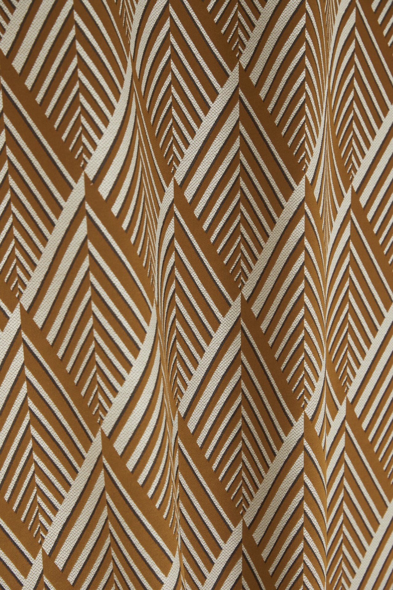 Der dekorative und Polsterstoff Ariane der Marke Lelievre Paris zeigt ein beeindruckendes geometrisches Muster aus Rauten mit Streifen in drei Farben auf leicht satinartigem Hintergrund. Der Stoff erzeugt einen rhythmischen Kontrast der Texturen, verstärkt durch eine dunkle Linie als Schatteneffekt, die Tiefe und Ausdruck verleiht.